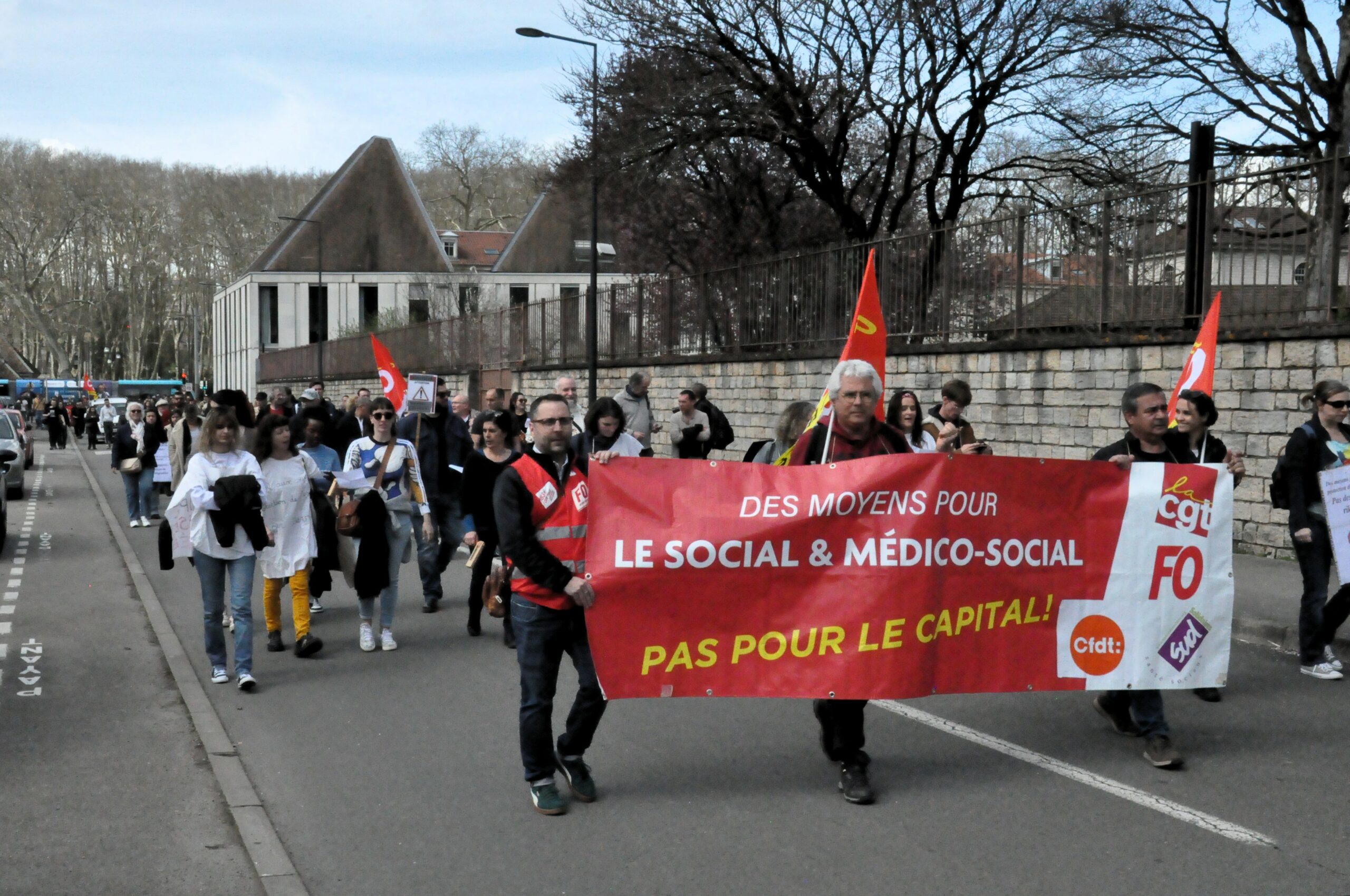 Hier lundi 25 mars, les petites mains de la protection de l’enfance étaient mobilisées. Après un rassemblement à midi esplanade des Droits Humains, ce sont près de deux cents personnes qui ont gagné le Conseil Départemental du Doubs. En ligne de mire, la séance de 14h30, qui devait valider les financements à venir. Sur place, le cortège a été accueilli par un important dispositif policier. « On demande des moyens pour les gosses, on est reçu·e·s avec des matraques. Symboliquement, tout est dit » lâche un observateur. Les éducateurs et éducatrices de rue étaient naturellement en première ligne, un tiers de leurs postes étant en jeu.