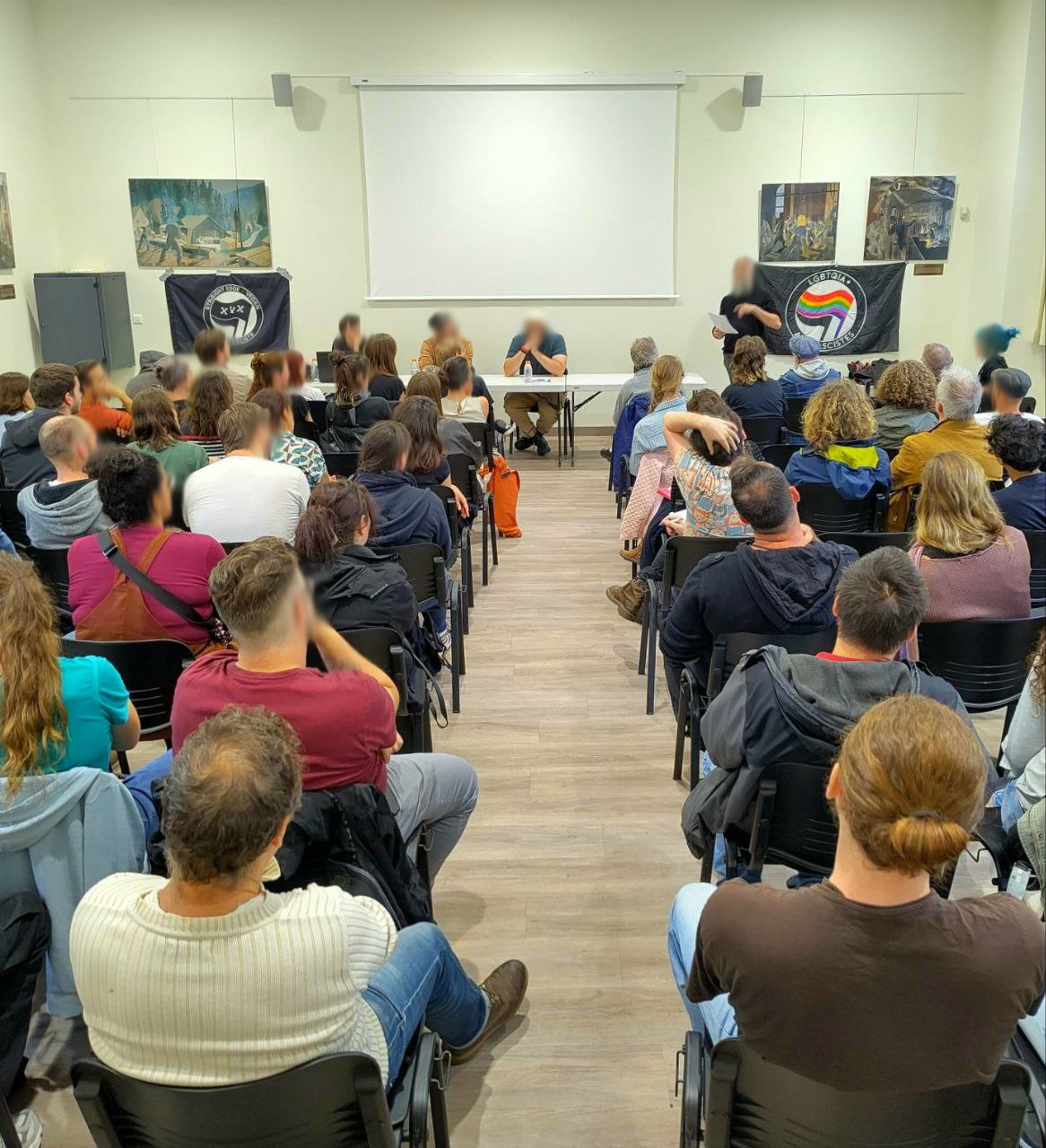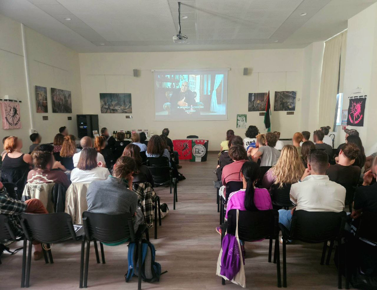 La semaine débutait mardi à la « SCOPS » , par la rencontre du syndicat « Partage, Droit, Autonomie ». Mais, rapidement, les capacités d’accueil sont saturées. « On ne s’attendait pas à autant de monde, bien au-delà des soutiens et habitué·e·s » s’enthousiasmait une responsable. À l’instar de cette introduction, les trois conférences et projections qui ont suivi, à la « Maison du Peuple » et à « Hôp Hop Hop », afficheront complet. « Panorama de l’extrême-droite » le mercredi, « nationalisme et féminisme » le jeudi, ou projection d’un film palestinien le vendredi, ont donc trouvé leur public. Un succès inattendu, tant les centrales politiques et syndicales traditionnelles ont surtout brillé par leur absence.