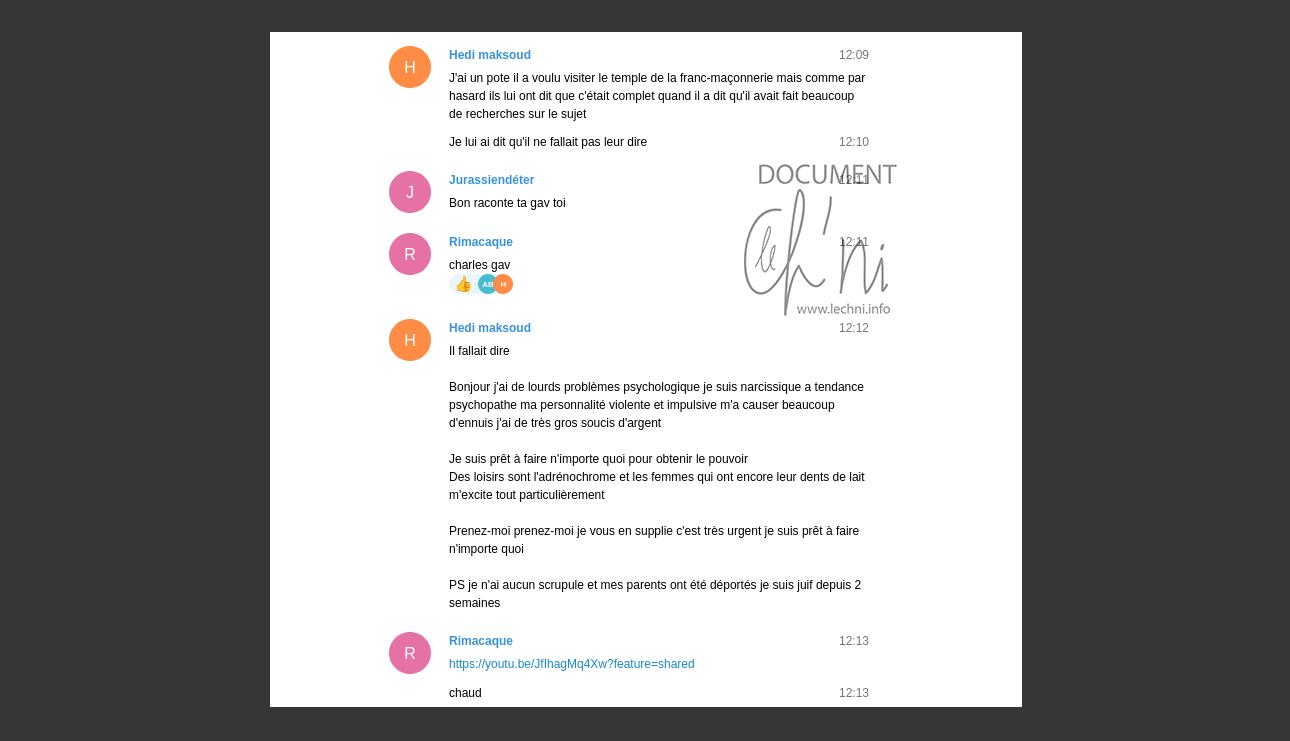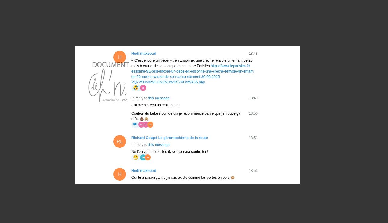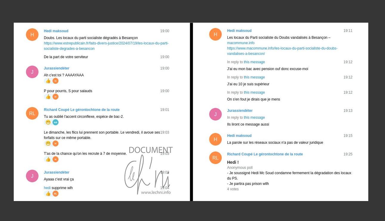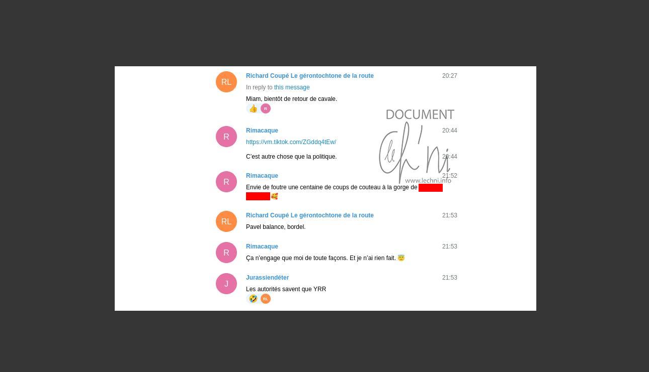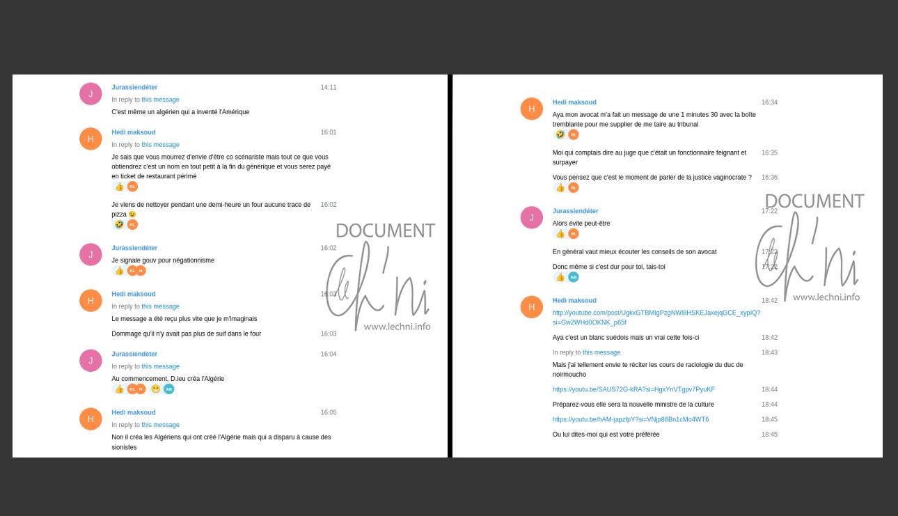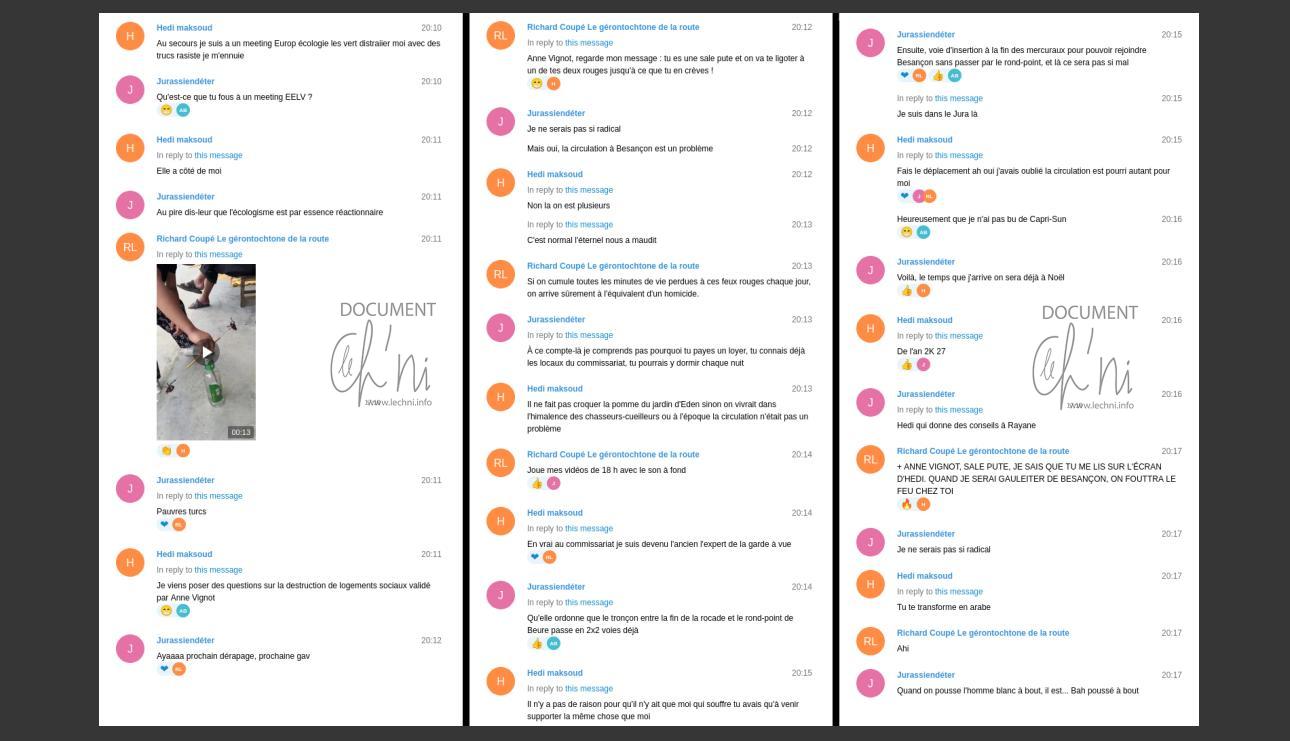 Toujours sur 2025, le jeune homme ne s’arrête pas là, trouvant « dommage qu’il n’y avait pas plus de juifs dans le four » le 10 février, se plaignant que « YouTube pense que je suis un bouègre » car lui envoyant « des pubs avec des femmes voilées en décolleté » le 2 mai, jusqu’à la réaction aux difficultés d’un enfant en questionnant la « couleur du bébé » pour achever sur un smiley [étron] et [singe] le 2 juillet. Les conversations prennent aussi des méandres plus personnels et directs, comme le 20 juin, où il lance « je suis à un meeting EÉLV, distrayez-moi avec des trucs racistes ». Précisant être à côté de la maire, les réponses haineuses vont alors cibler l’édile : « Anne Vignot, regarde mon message : tu es une sale pute et on va te ligoter à un de tes feux rouges jusqu’à ce que tu en crèves ! » puis « je sais que tu me lis sur l’écran d’Hedi. Quand je serai Gauleiter de Besançon, on foutra le feu chez toi ». Loin de le freiner, l’initiateur de ces échanges ajoute un [rire] et une [flamme].