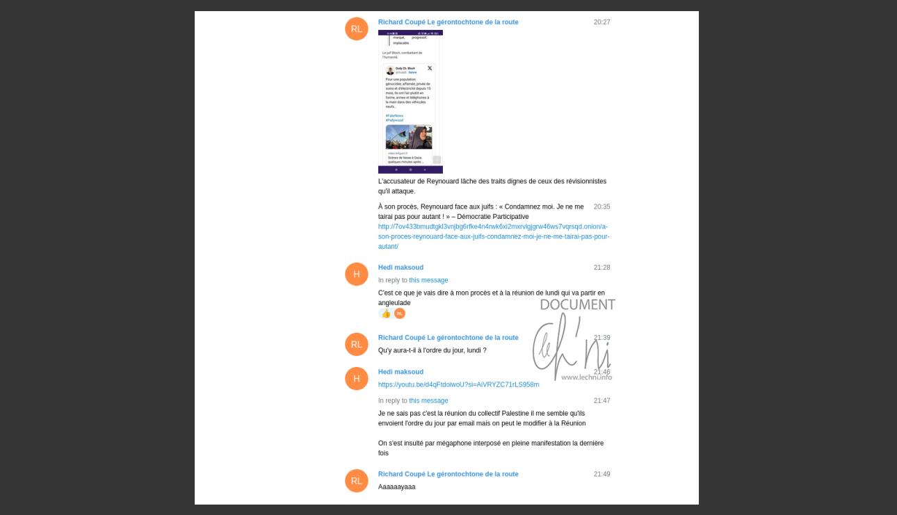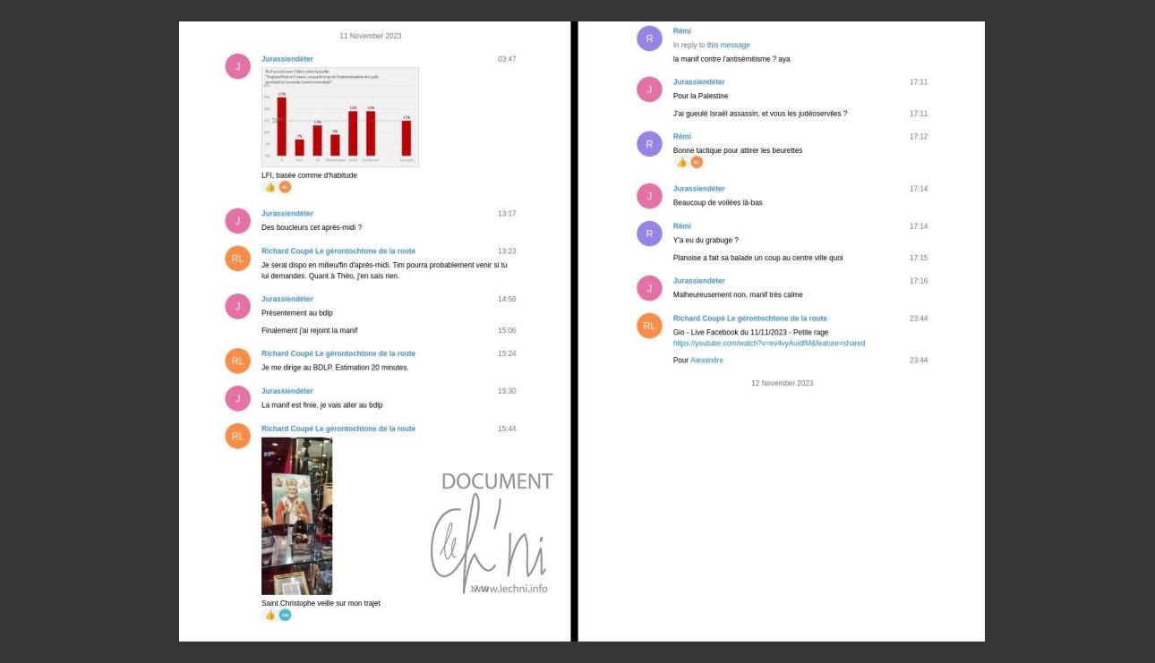 D’une délibération sur les airs « youtrement suspects » de l’officier SS Heinrich Himmler, à la proposition d’acheter un sceau frappé de la croix gammée, en passant par la mise en scène d’un exemplaire du Coran souillé d’une tranche de lard, la cellule s’est ainsi répandue en milliers de publications nauséabondes depuis maintenant trois ans. Mais entre le quartier de Planoise où vivent la plupart des protagonistes et les retrouvailles au « bar de la Poste » dans la Boucle, érigé en quartier général, la transposition au réel est aussi palpable. D’abord pour se coordonner à l’occasion de mouvements sociaux bénéficiant de leurs faveurs, Hedi Maksoud et Timmy L. alléguant ainsi leur concours régulier aux défilés du « collectif Palestine » à Besançon ; ainsi que Alexandre V. alias « jurassien déter » qui fut très impliqué en 2023-2024, relatant y avoir crié un slogan sur les « judéoserviles » ou soulignant le fait qu’il y ait « beaucoup de voilées là-bas ».