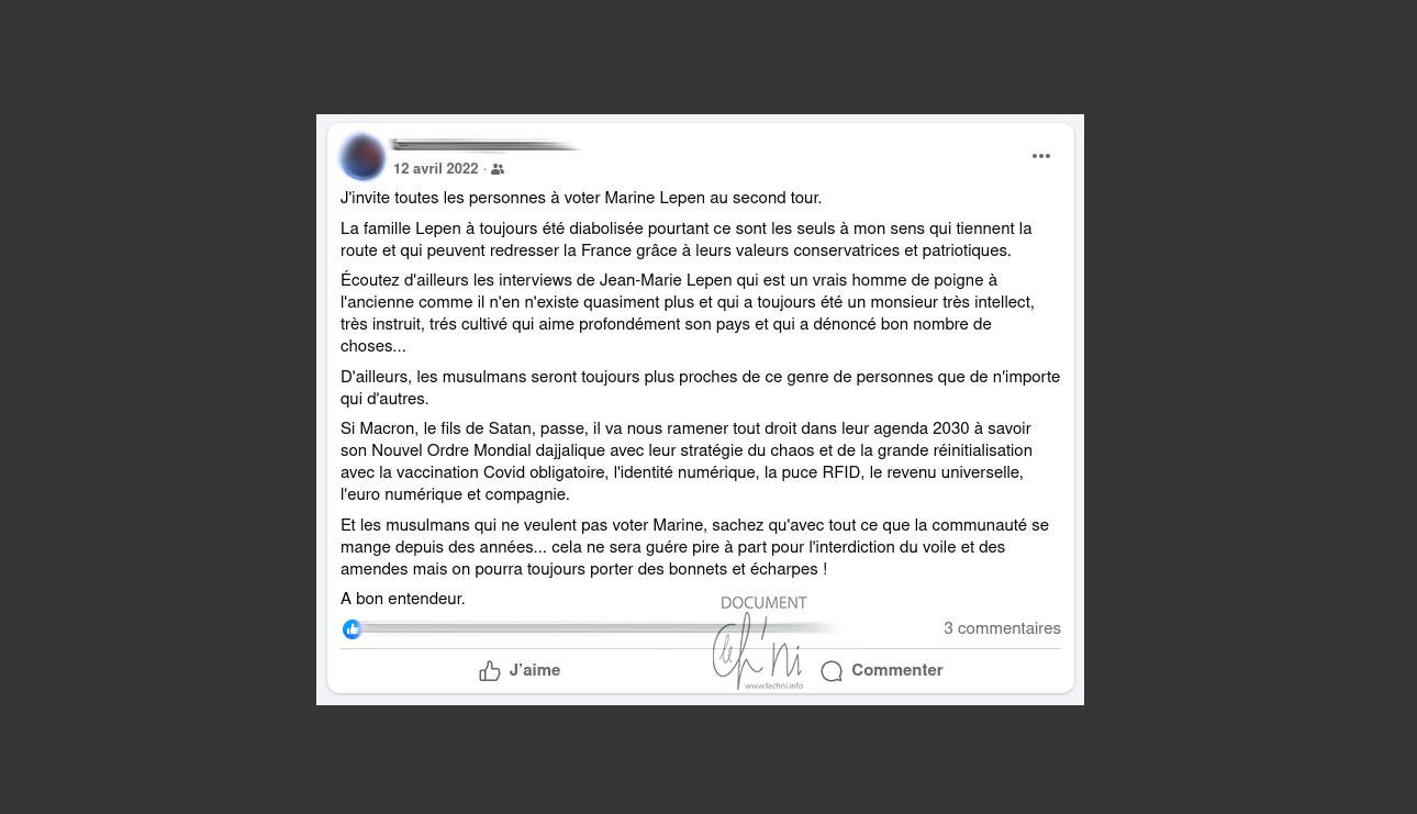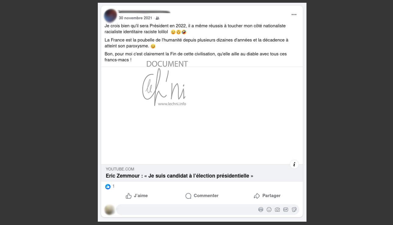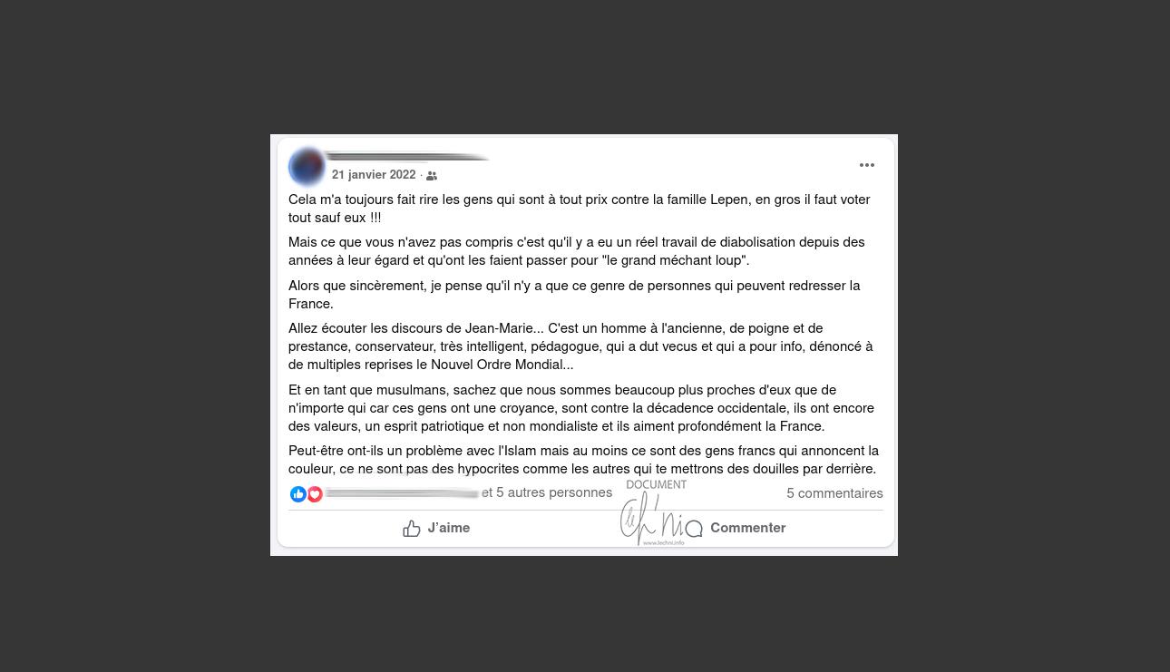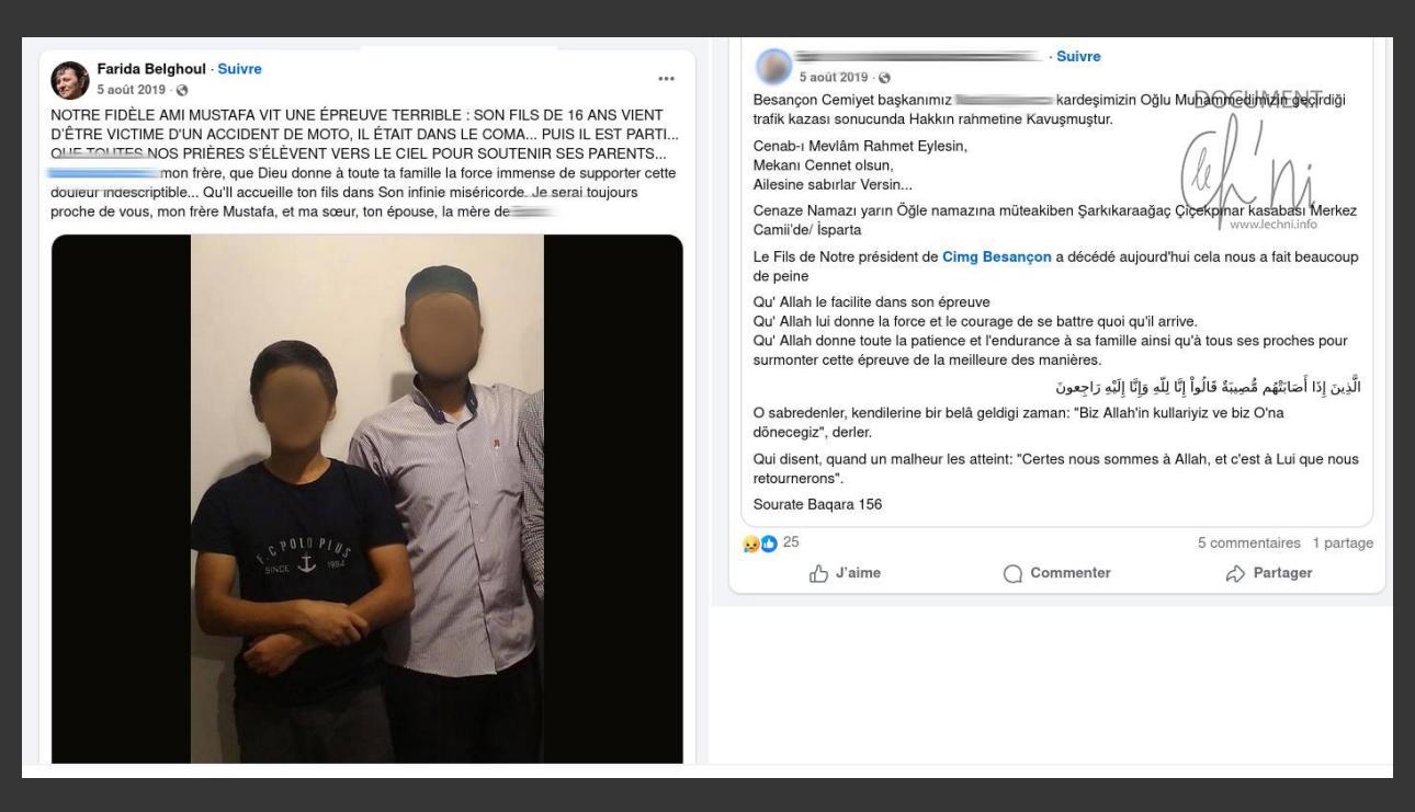 Questionné mercredi 22 octobre par courrier électronique en vue d’une publication ce jour, Hedi Maksoud nous a répondu le lundi suivant qu’il était prêt à donner une suite favorable ; mais, relancé dans la foulée, il n’a, depuis, plus donné signe de vie. Concernant A. via son compte « Facebook », elle confirme qu’elle « regarde et écoute tout le monde… que cela soit des musulmans, des « complotistes », des islamophobes, des néonazis, des politiciens, des coachs de vie divers, influenceurs ect » (lire son retour complet). Pour ce qui est du « collectif Palestine » de Besançon, c’est la présidente de « Palestine Amitié », Françoise Piaget, qui nous a adressé ces précisions : « Hedi [Maksoud] n’est pas au collectif, nous avons été plusieurs à désavouer cette banderole [Frexit] publiquement […] Khaled [Ben M’Barek] s’est mis en dehors du collectif. Le collectif n’a ni approuvé, ni encouragé les échanges avec Toufik-de-Planoise (cf courrier du 10 juillet) ».