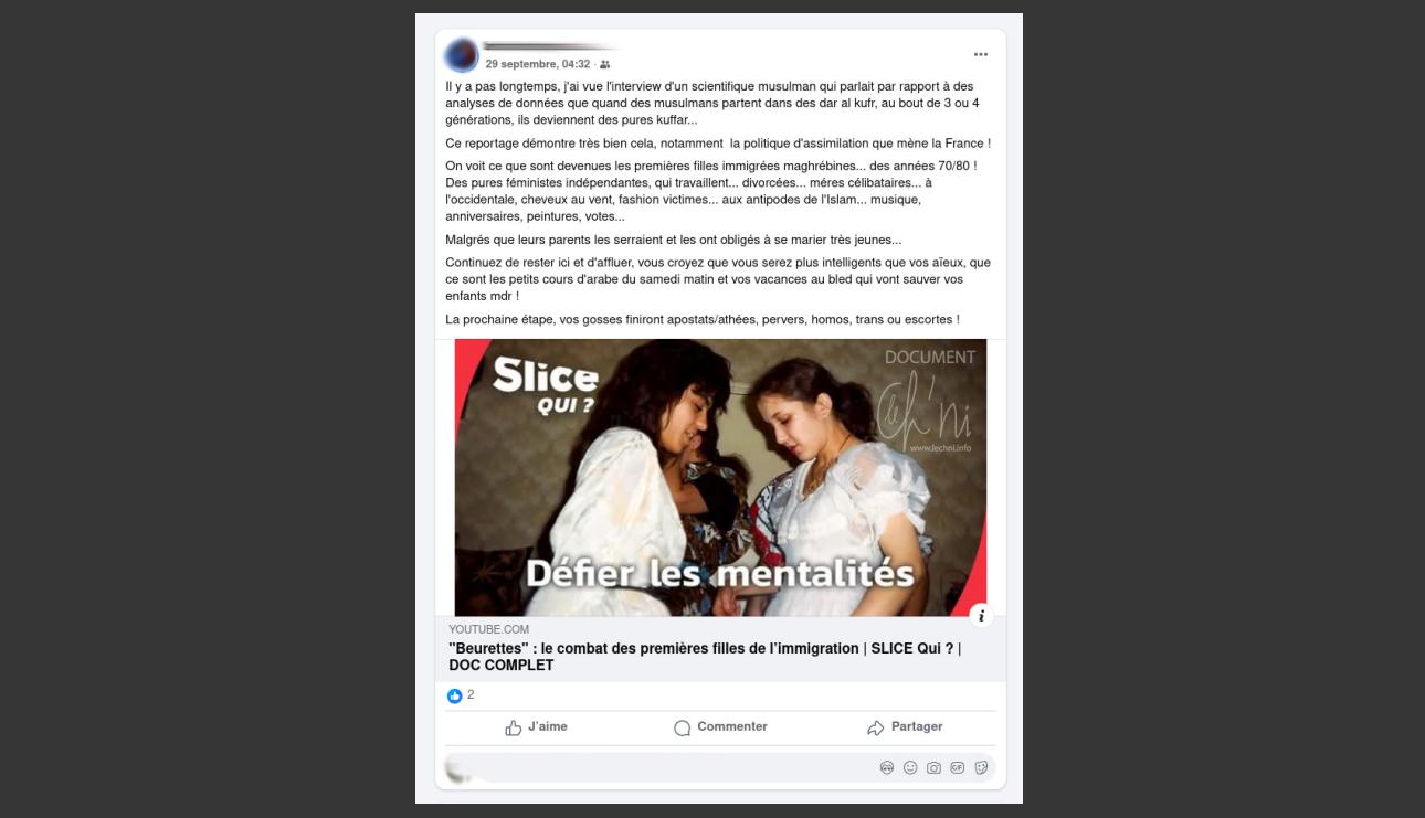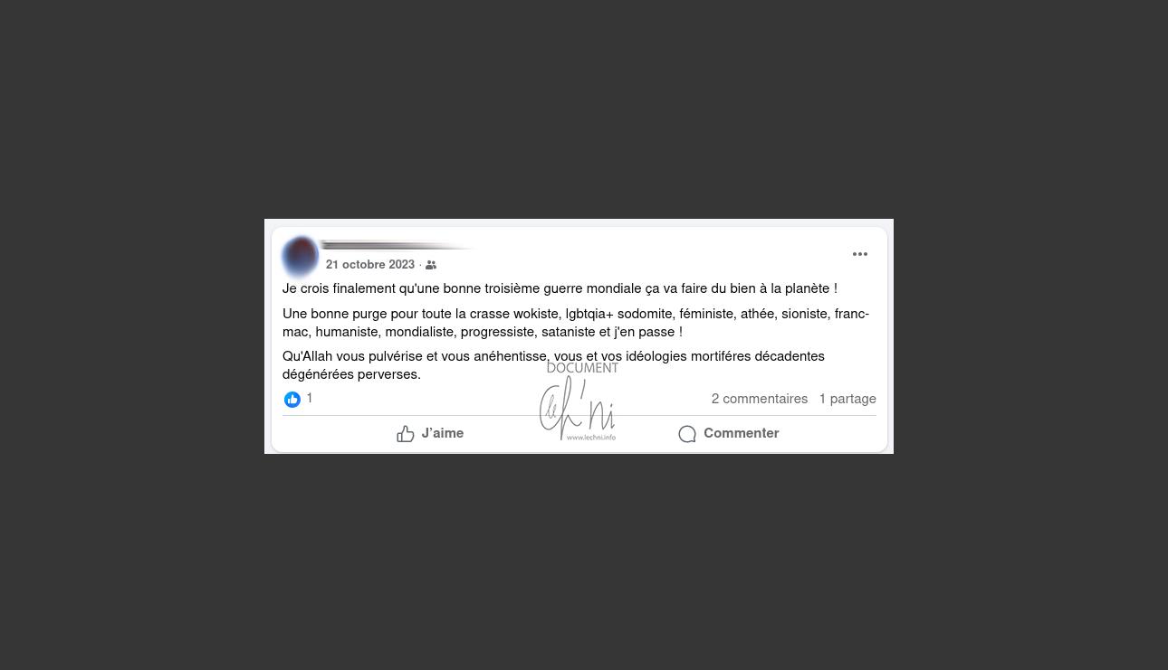 En reprenant les autres comparses équivoques qui tournent autour de la nébuleuse, fréristes et complotistes ne manquent pas, ainsi que le souligne l’écrivain Mustapha Kharmoudi ce 18 octobre. Mais c’est la prose d’une militante déterminée que nous analyserons, tant celle-ci est en phase avec la première partie de cet article. L’intéressée se nomme A., se décrivant comme une musulmane pieuse. Ce qui ne va pas l’empêcher d’enchaîner les diatribes, avec des concepts qui n’ont souvent rien à envier aux précédents. Le 21 octobre 2023, elle résume ainsi l’étendue de sa pensée sur « Facebook » : « Je crois finalement qu’une bonne troisième guerre mondiale ça va faire du bien à la planète ! Une bonne purge pour toute la crasse wokiste, lgbtqia+ sodomite, féministe, athée, sioniste, franc-mac, humaniste, mondialiste, progressiste, sataniste et j’en passe ! Qu’Allah vous pulvérise et vous anéhentisse, vous et vos idéologies mortiféres décadentes dégénérées perverses » (sic).
