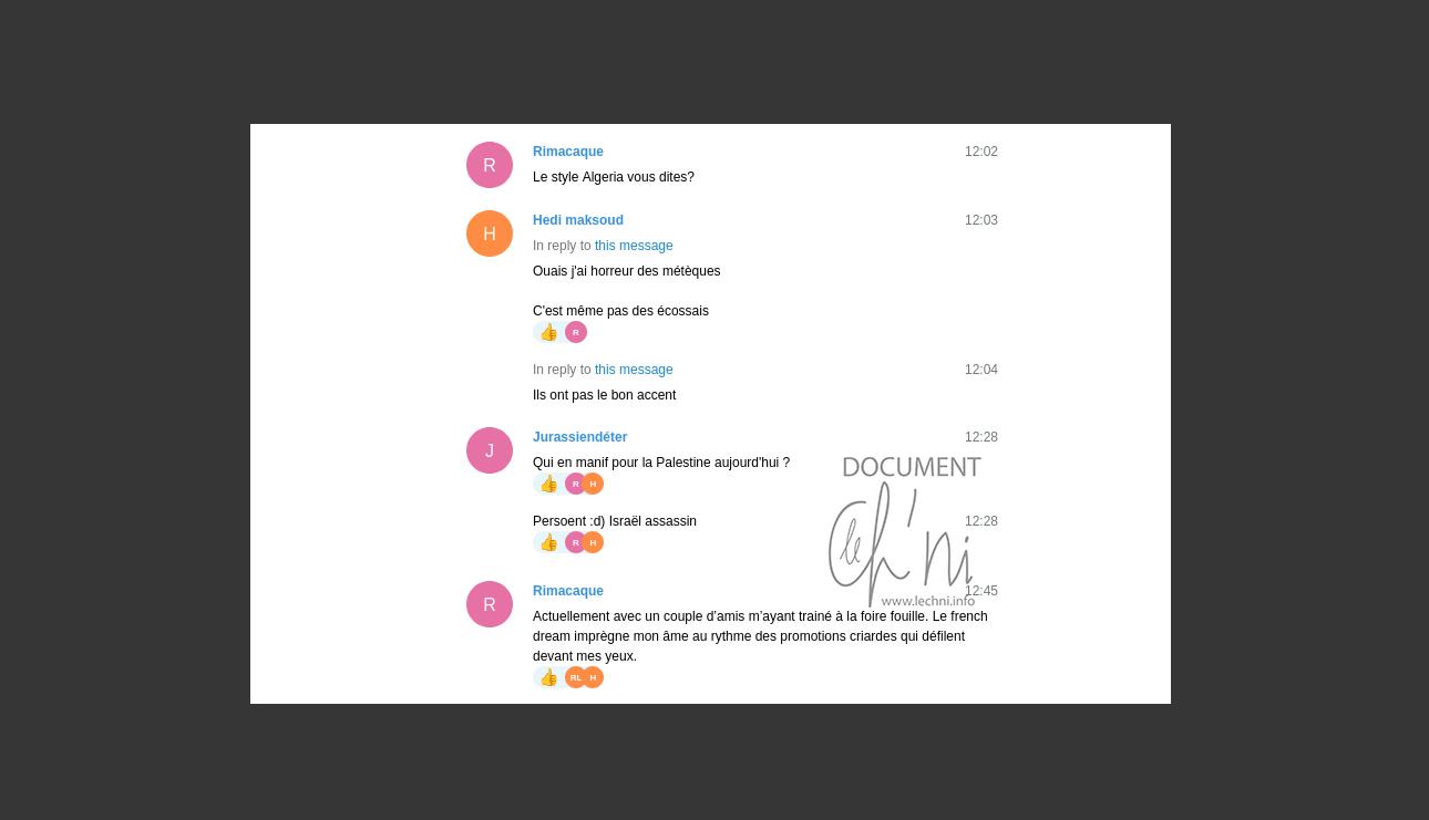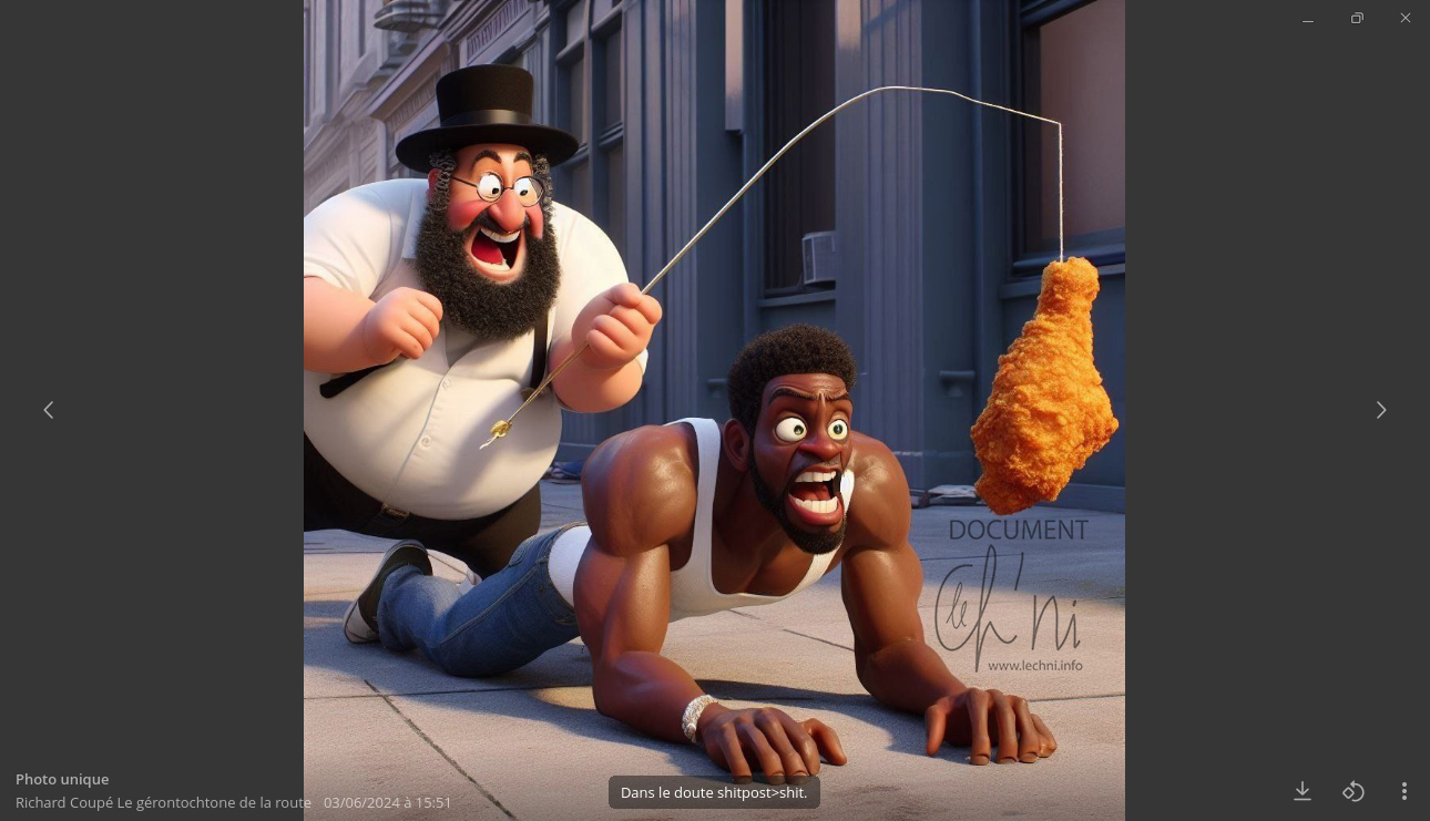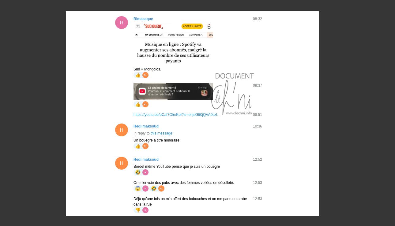 Pour le premier concerné, de pures calomnies. Fascisant, lui ? Certainement pas. En tout cas pas de manière assumée, quand il faut s’adresser aux révolté·e·s intersectionnel·le·s du vieux-centre. Mais en surfant avec des marges plus intimes, sa langue se débride. Repéré au sein d’un groupe « Telegram », il officie avec des compagnons du secteur, dont Timmy L., son colocataire, qui s’est choisi le pseudo. de « Rimacaque » en référence à Rima Hassan. S’il n’a été ouvert que le 29 mars 2022 et compte dix inscrits, ce canal est un déferlement quotidien ciblant les « nègres », « métèques », « youpins », « gnoules », « pédales »… Totalement à l’aise avec le registre et ses hôtes, Maksoud poste épisodiquement des photographies de lui, comme le 15 janvier 2024 en supermarché, avec une barquette de porc détournant la formule marxiste « Goy de tous les pays unissez-vous » ou le 17 mai dernier, en terrasse du quai Vauban, tenant le journal antisémite « Rivarol ».
