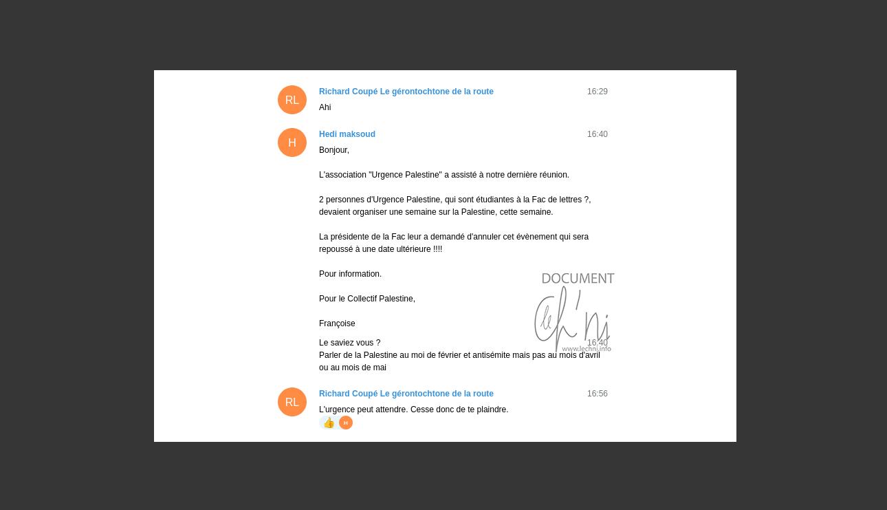 Avant de conclure en renvoyant aux manifestations, conférences, films, assurant « avoir réussi de très belles choses ensemble » (lire son retour complet). Mais sans jamais expliquer comment des individus si « infréquentables » se retrouvent encore dans les réunions et cortèges du « collectif Palestine ». Quant aux autres composantes du « collectif Palestine » de Besançon, aucun·e signataire n’a jugé utile de s’exprimer spontanément sur la situation, que ce soit « la France Insoumise », « les Écologistes », la « Ligue des Droits de l’Homme », la « Fédération Syndicale Unitaire », « Génération·s », ou « Ensemble ! ». Ailleurs, les choses évoluent quand même… Via un mail du 24 octobre 2025, la section « ATTAC » de Besançon nous informe ainsi que « certains membres du CA ont décidé de ne plus se réunir en présence de Hedi M[aksoud] et d’organiser nos actions sans lui à cause de ses excès et de ses dérives répétées au moins depuis une année ».