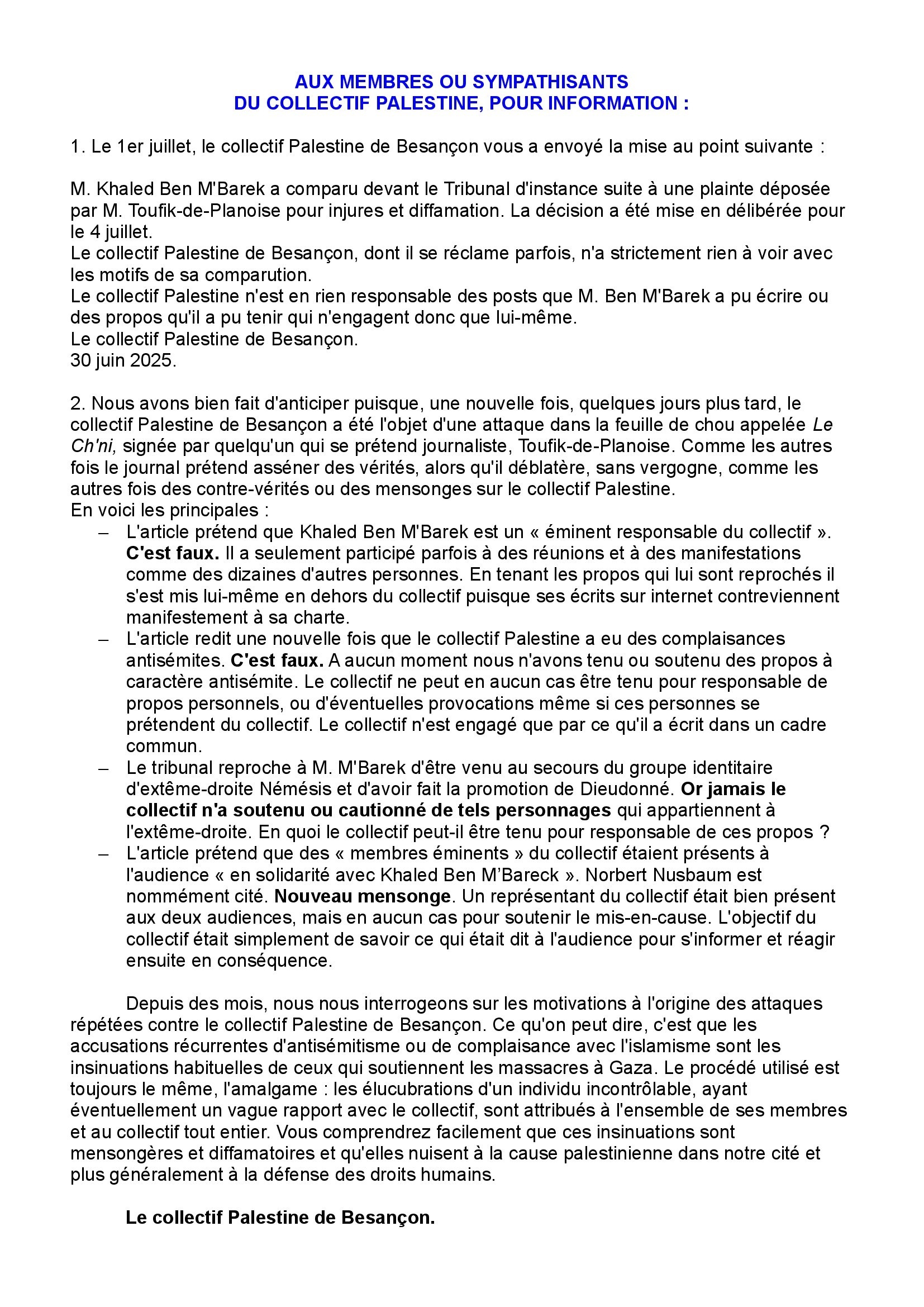 Avant de conclure en renvoyant aux manifestations, conférences, films, assurant « avoir réussi de très belles choses ensemble » (lire son retour complet). Mais sans jamais expliquer comment des individus si « infréquentables » se retrouvent encore dans les réunions et cortèges du « collectif Palestine ». Quant aux autres composantes du « collectif Palestine » de Besançon, aucun·e signataire n’a jugé utile de s’exprimer spontanément sur la situation, que ce soit « la France Insoumise », « les Écologistes », la « Ligue des Droits de l’Homme », la « Fédération Syndicale Unitaire », « Génération·s », ou « Ensemble ! ». Ailleurs, les choses évoluent quand même… Via un mail du 24 octobre 2025, la section « ATTAC » de Besançon nous informe ainsi que « certains membres du CA ont décidé de ne plus se réunir en présence de Hedi M[aksoud] et d’organiser nos actions sans lui à cause de ses excès et de ses dérives répétées au moins depuis une année ».