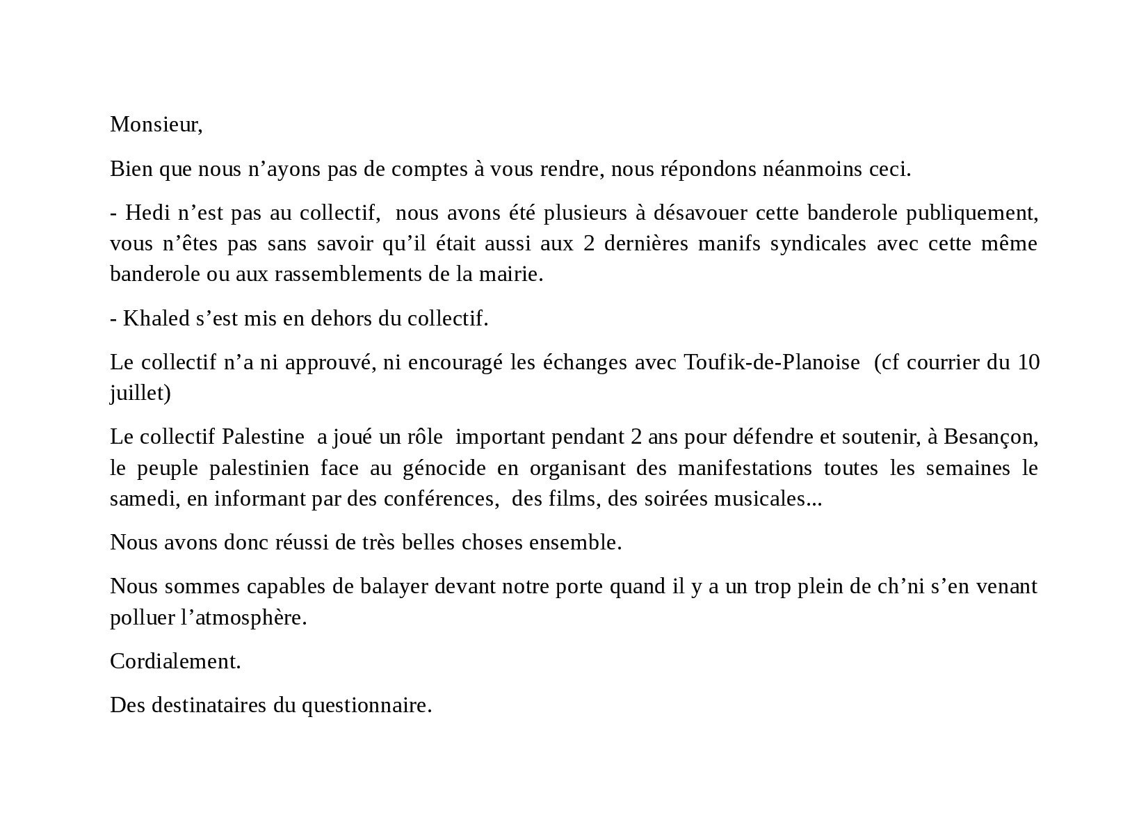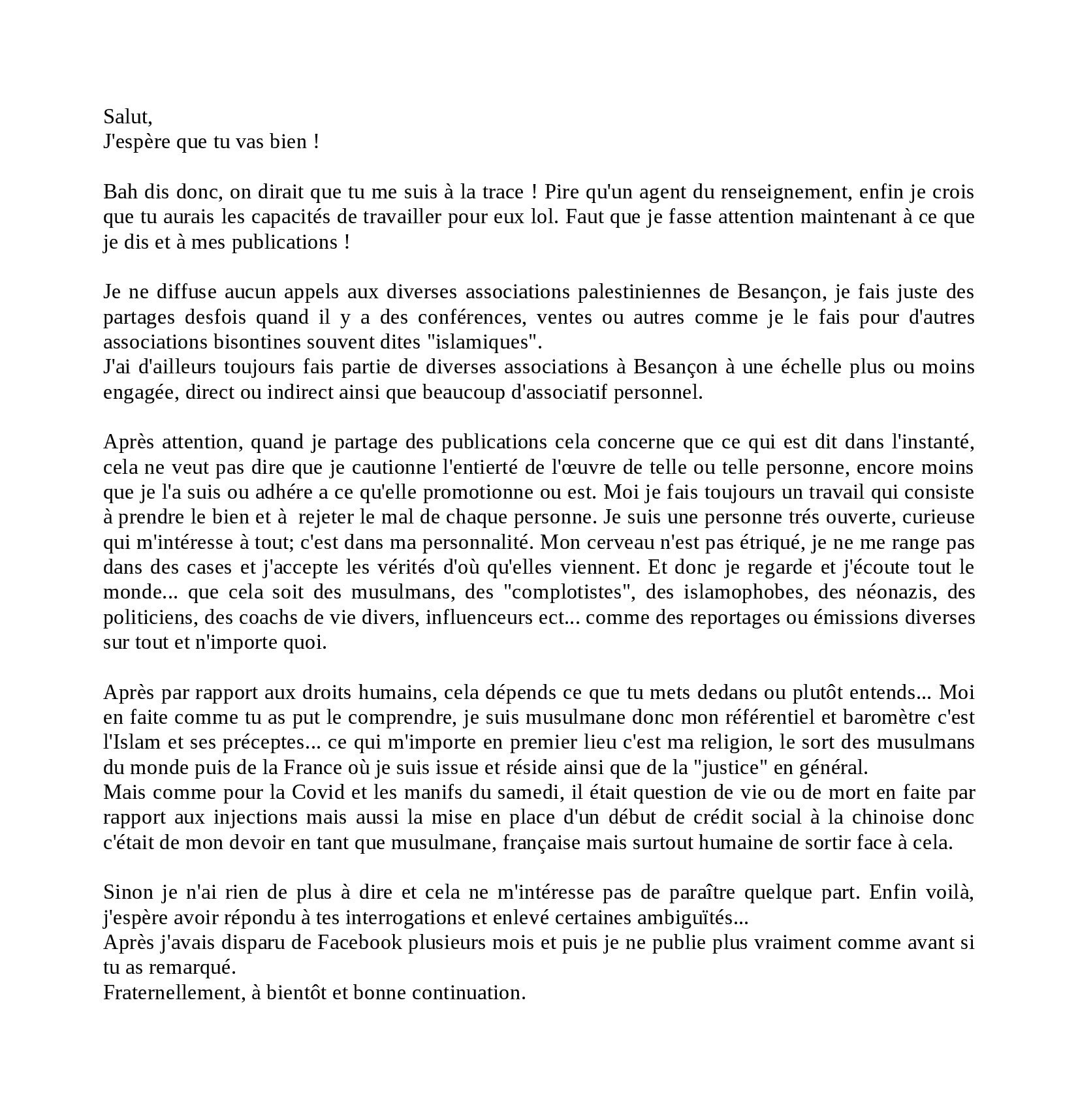 Questionné mercredi 22 octobre par courrier électronique en vue d’une publication ce jour, Hedi Maksoud nous a répondu le lundi suivant qu’il était prêt à donner une suite favorable ; mais, relancé dans la foulée, il n’a, depuis, plus donné signe de vie. Concernant A. via son compte « Facebook », elle confirme qu’elle « regarde et écoute tout le monde… que cela soit des musulmans, des « complotistes », des islamophobes, des néonazis, des politiciens, des coachs de vie divers, influenceurs ect » (lire son retour complet). Pour ce qui est du « collectif Palestine » de Besançon, c’est la présidente de « Palestine Amitié », Françoise Piaget, qui nous a adressé ces précisions : « Hedi [Maksoud] n’est pas au collectif, nous avons été plusieurs à désavouer cette banderole [Frexit] publiquement […] Khaled [Ben M’Barek] s’est mis en dehors du collectif. Le collectif n’a ni approuvé, ni encouragé les échanges avec Toufik-de-Planoise (cf courrier du 10 juillet) ».