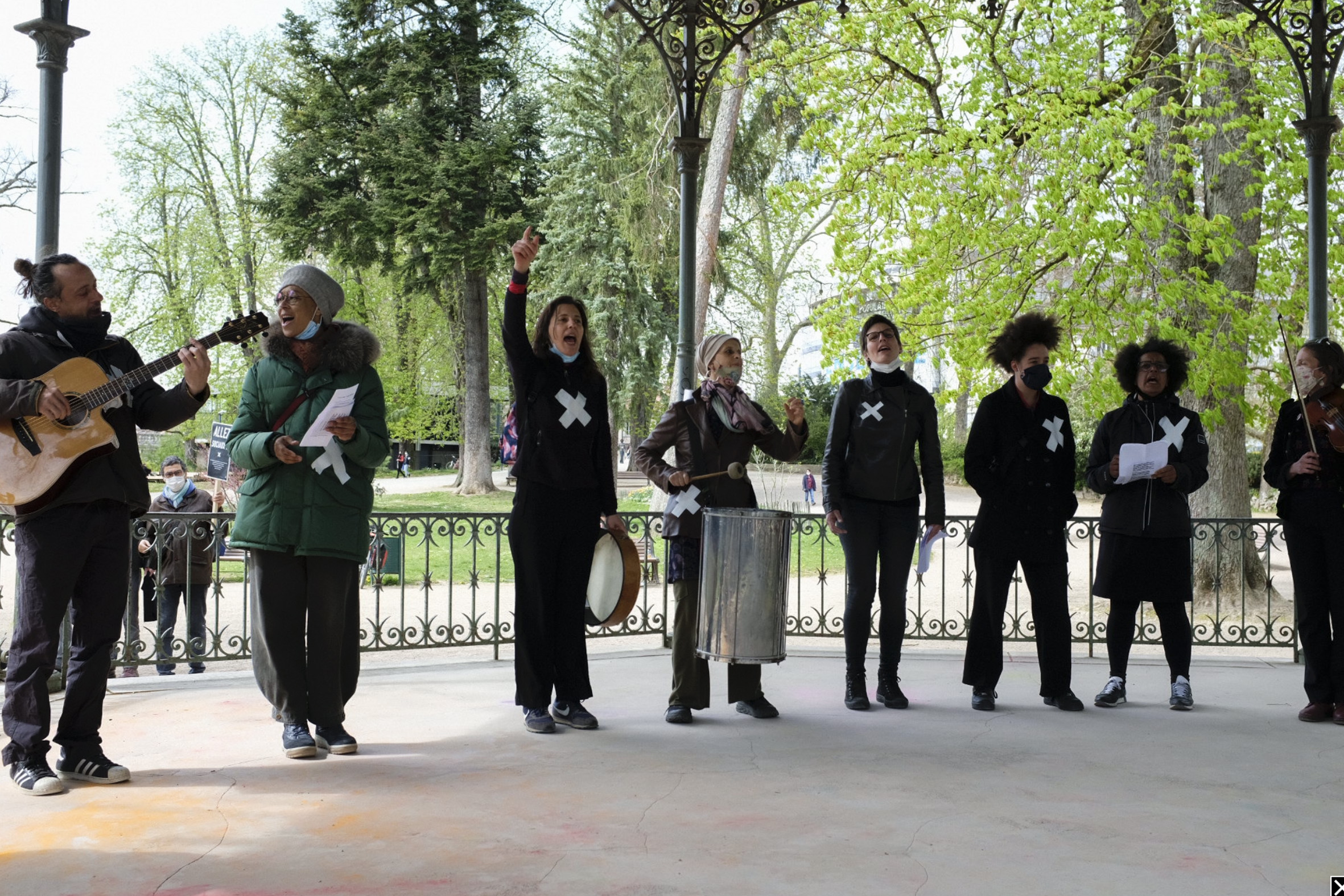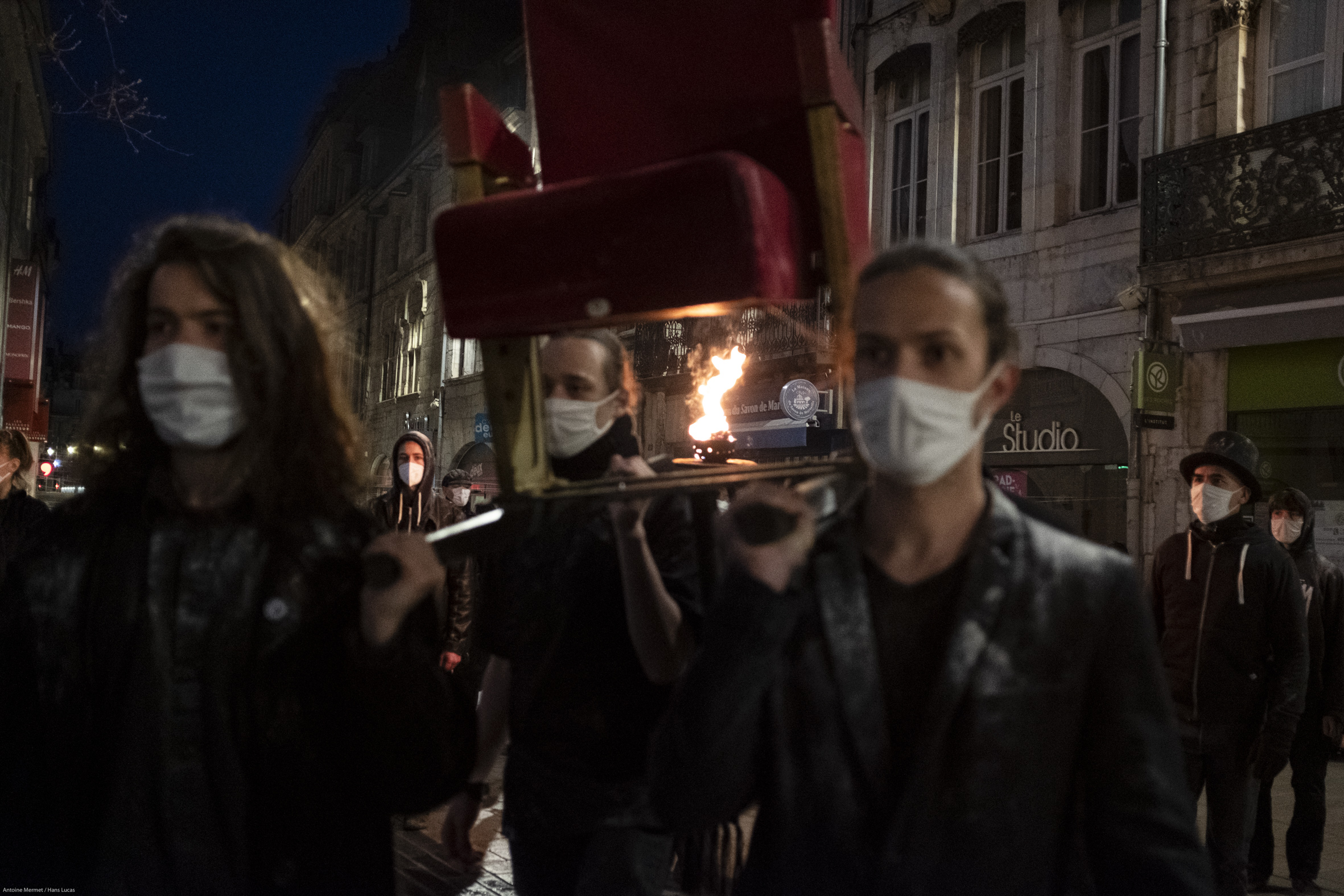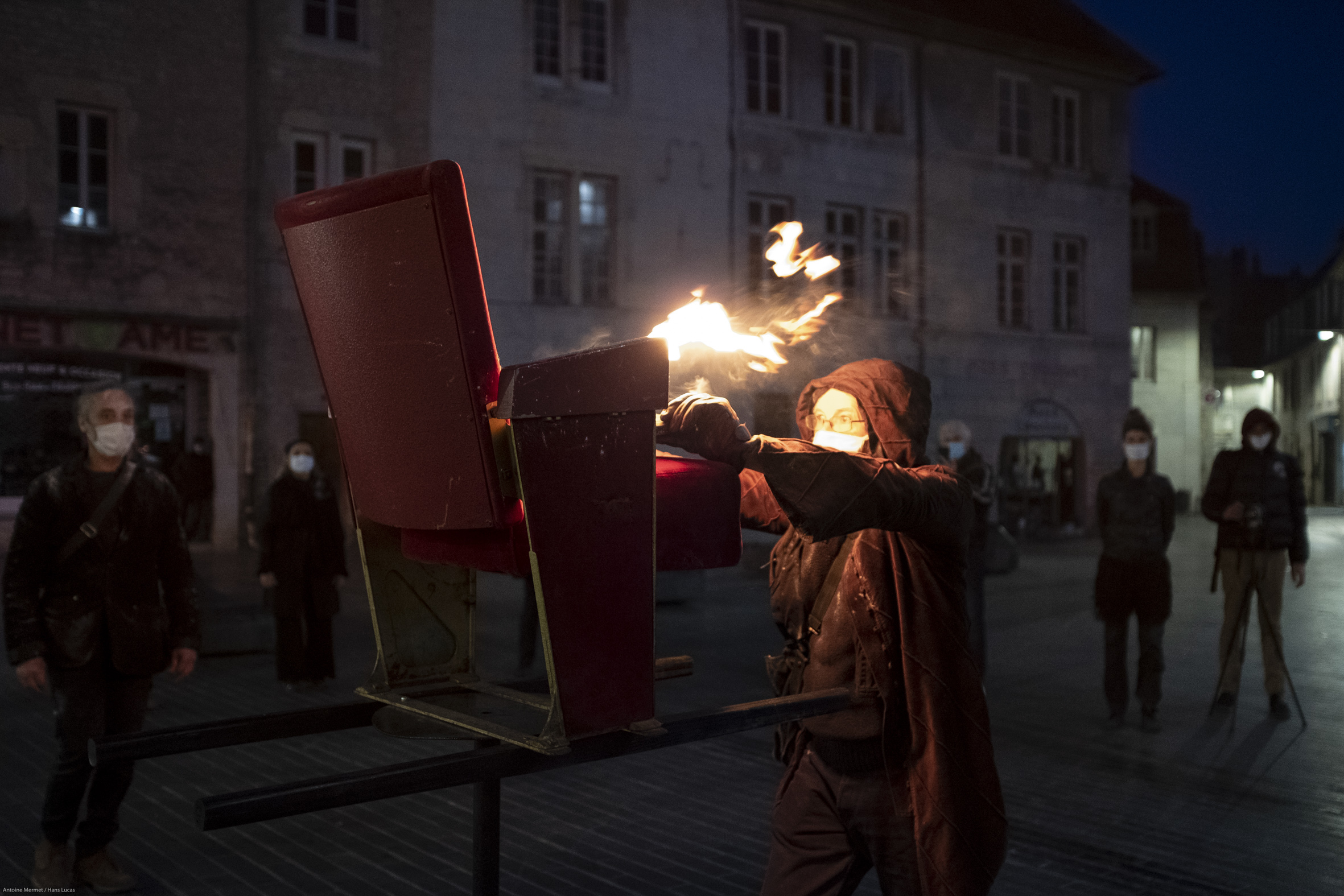 À la suite d’un premier acte, des artistes s’étaient réunis à 4h30 à la « friche artistique » avant de prendre la direction du centre-ville pour réaliser leur prestation avant le lever du soleil, pour « enterrer la culture d’avant le covid et croire en un avenir meilleur »