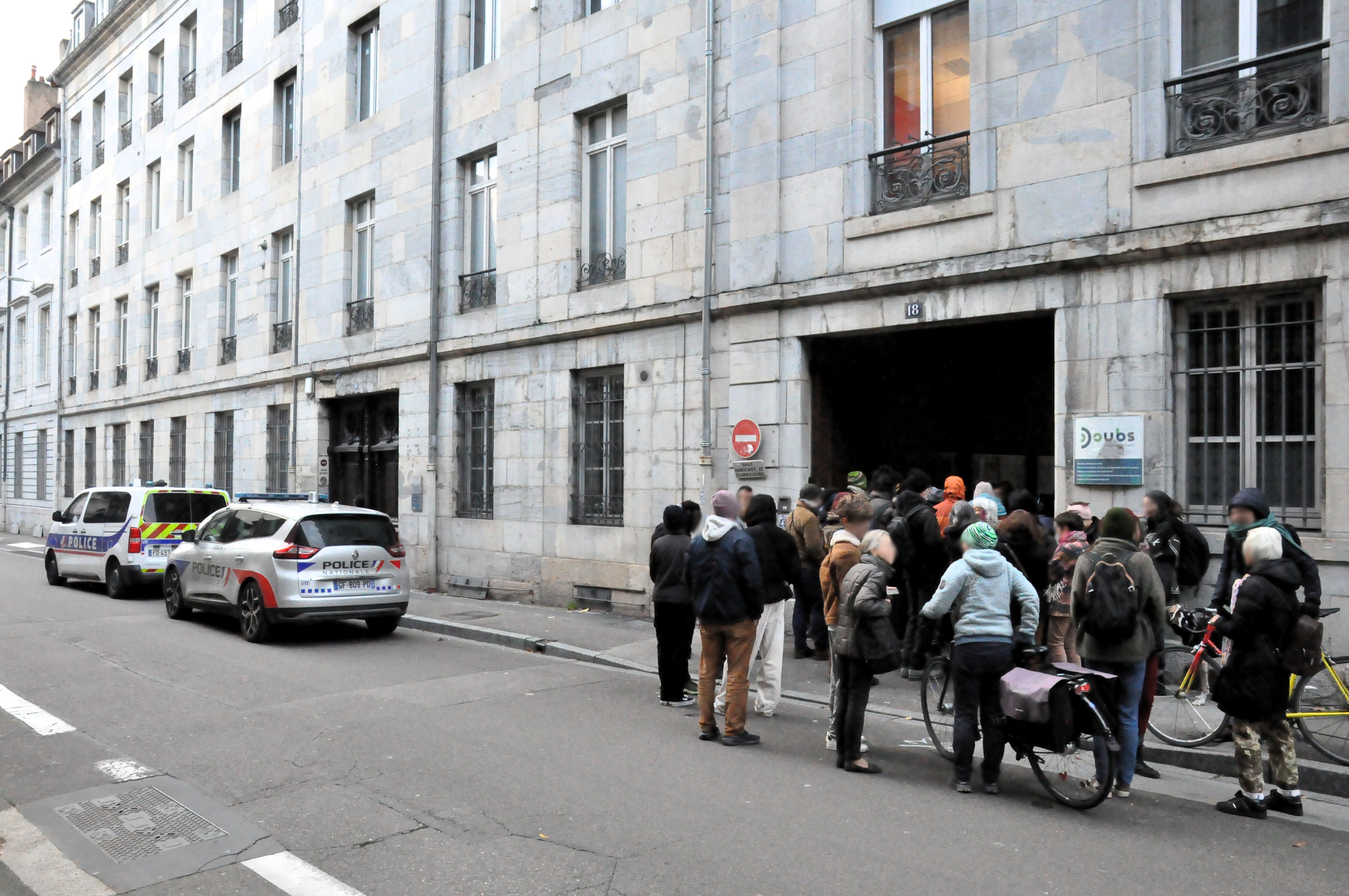Les collations proposées finies, une trentaine de participant·e·s poursuivent jusqu’à la « direction territoriale des solidarités humaines » rue de la préfecture. « À Besançon, c’est une antenne déterminante dans le processus qu’on dénonce. Aujourd’hui, on veut être auprès d’un mineur qui doit obtenir certaines pièces. Mais la délivrance traîne de façon excessive, au point de compromettre ses procédures. Alors on veut montrer qu’il n’est pas seul et alerter par des tracts, pour aider un peu à accélérer les choses » nous signifie-t-on. Mais, devant le bâtiment, les cadres de l’institution goûtent peu l’initiative, sollicitant la police après avoir expliqué que « le maximum est fait ». Les activistes, elleux, promettent de revenir prochainement, autant qu’il le faudra.