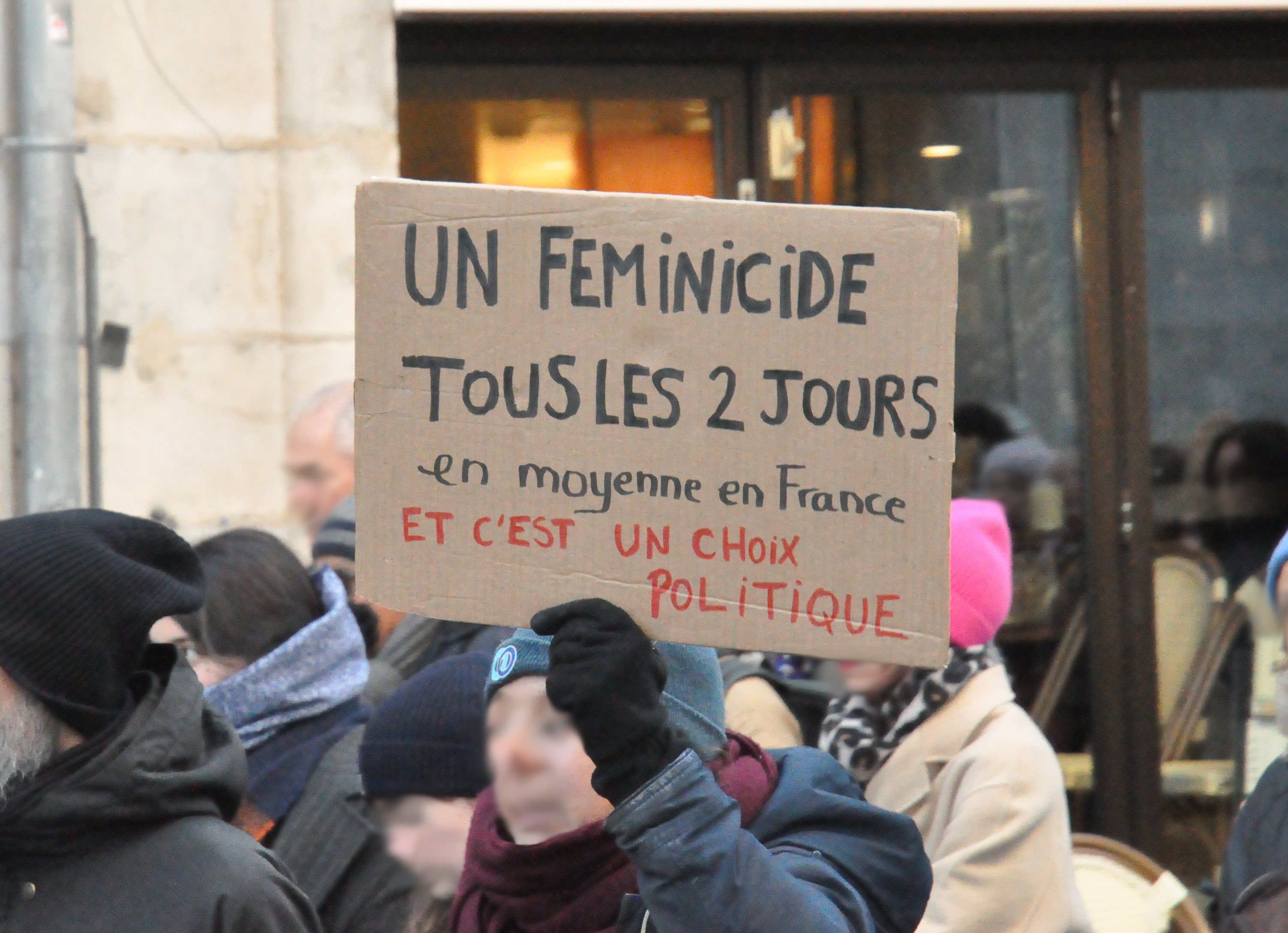 Détail d’une pancarte, indiquant « un féminicide tous les deux jours en moyenne en France – et c’est un choix politique ».