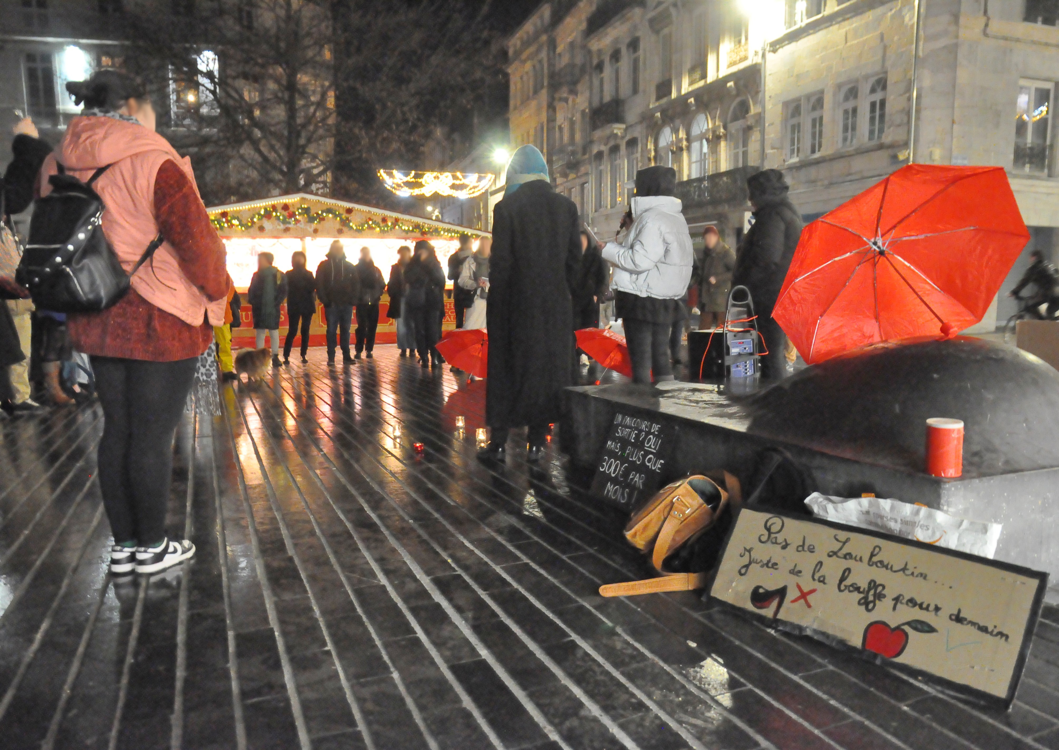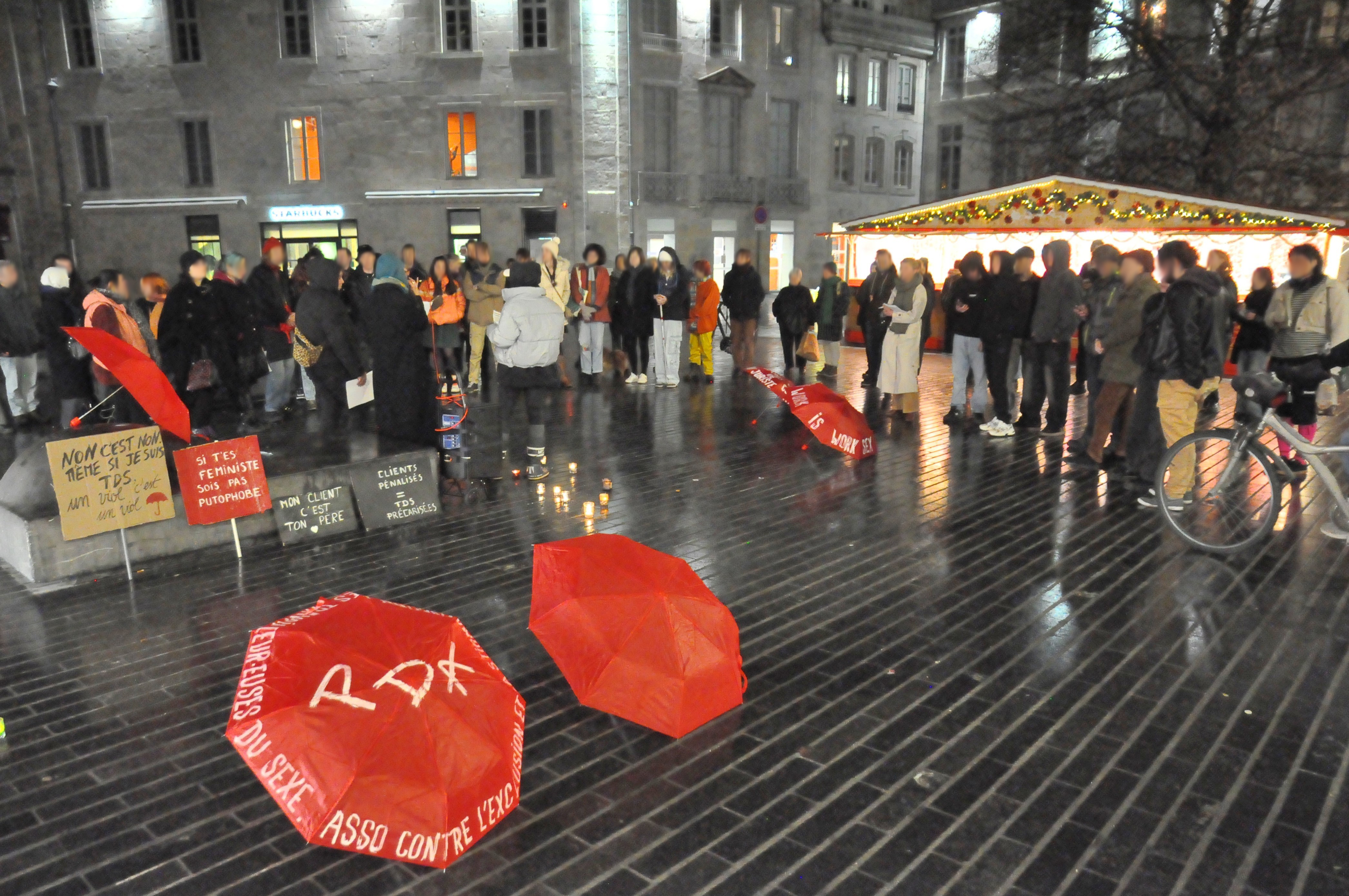 Illustration d’en-tête : Aperçu du rassemblement « pour l’élimination des violences faites aux travailleuses et travailleurs du sexe », hier soir place Louis Pasteur. Outre des pancartes et des bougies, on peut aussi apercevoir des parapluies rouges en symbole du combat des TDS.