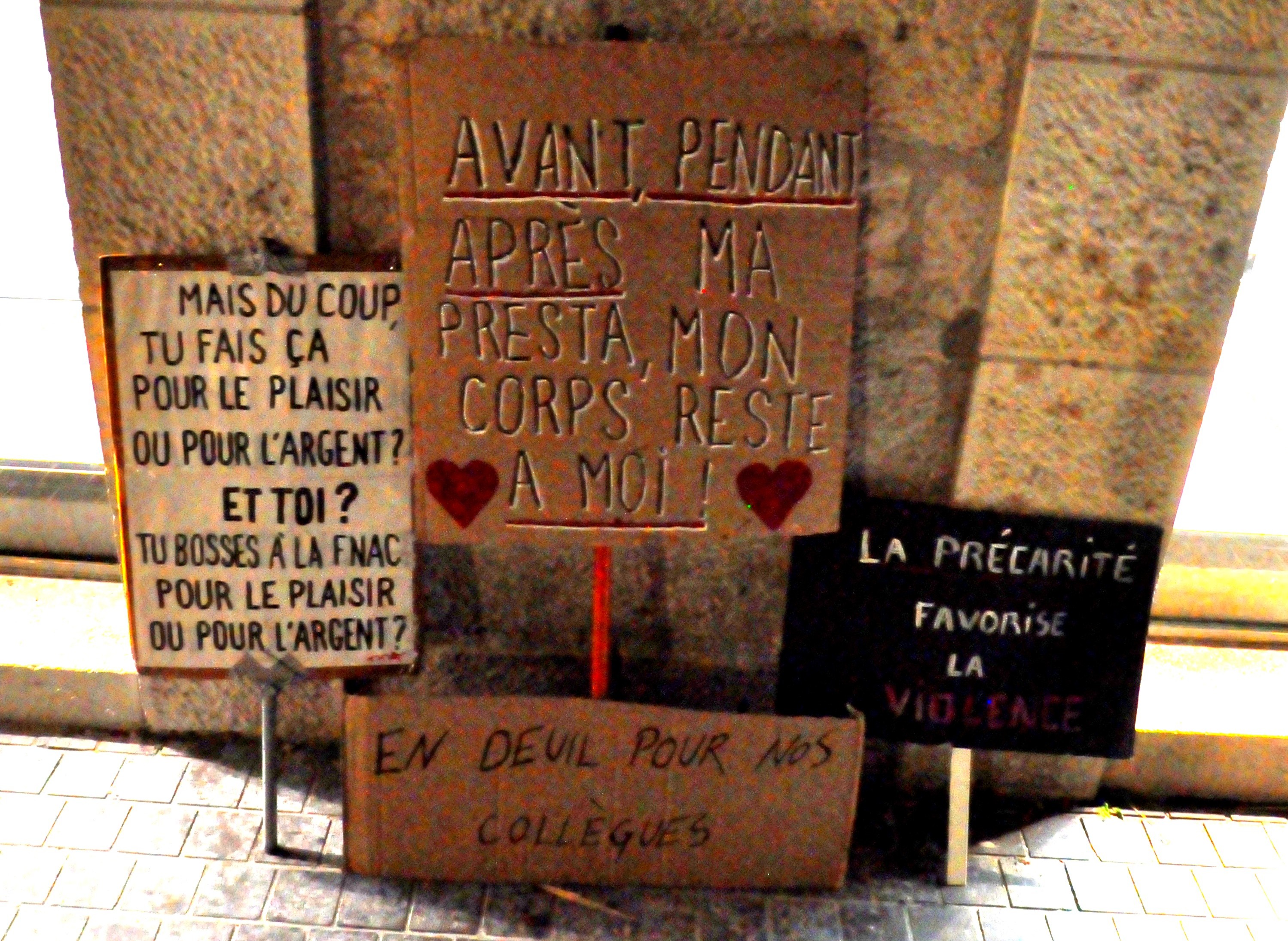 « Pour celleux qui sont étrangers/étrangères sans-papiers, trans/LGBT+, neuroatypiques, c’est parfois la seule façon de survivre. Nous aussi, on paie le loyer ! Tout ce qu’on demande, c’est donc de pouvoir exercer sans craintes notre gagne-pain. Les réalités de la traite des êtres humains ou des abus sur mineur·e·s, évidemment, on les dénonce sans faille. Mais on n’a pas à en porter le poids, le fait de nous taper opportunément dessus ne règlera en rien ces questions. Se cacher derrière ces infamies afin de nourrir la répression morale exigée par quelques petit·e·s-bourgeois·e·s abolos, c’est à la fois manipulatoire et odieux. Mais on n’en attend pas davantage des pouvoirs publics, en particulier la majorité municipale actuelle, qui valide toutes les mesures et rhétoriques putophobes » conclut une autre.