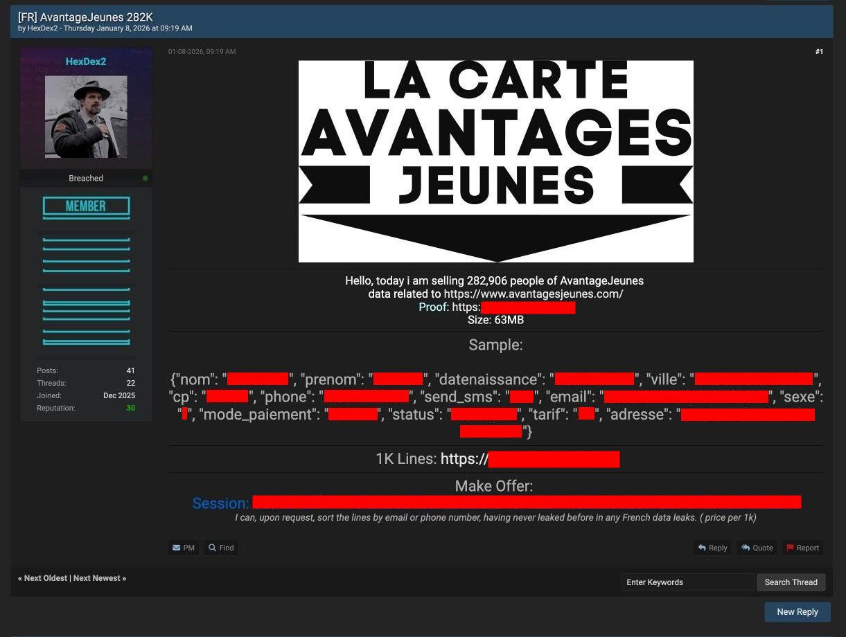 La publication date du 8 janvier, aussi laconique que glaçante. Elle émane de Christophe Boutry, ex-membre de la « DGSI » condamné pour avoir transmis des informations sur le darkweb. En fin connaisseur, il s’est depuis reconverti dans la veille et la sûreté numérique. Au point de lister les alertes chaque jour, répertoriant « les fuites de données d’entreprises françaises, de l’État, de services publics » afin de « centraliser les incidents connus, avec un objectif de suivi, de transparence et d’analyse ». Le fâcheux épisode d’il y a trois mois à Pontarlier, il l’avait disséqué et relayé. Via la « carte avantages jeunes », il avance que noms, prénoms, dates de naissance, adresses électroniques, numéros de téléphone, adresses postales et modes de paiement de 282 906 « cibles » seraient dans la nature. Ou plus exactement, dans l’escarcelle de « crackers/crackeuses », qui auraient fourni des « échantillons crédibles » tels que des « noms, adresses et numéros ».
