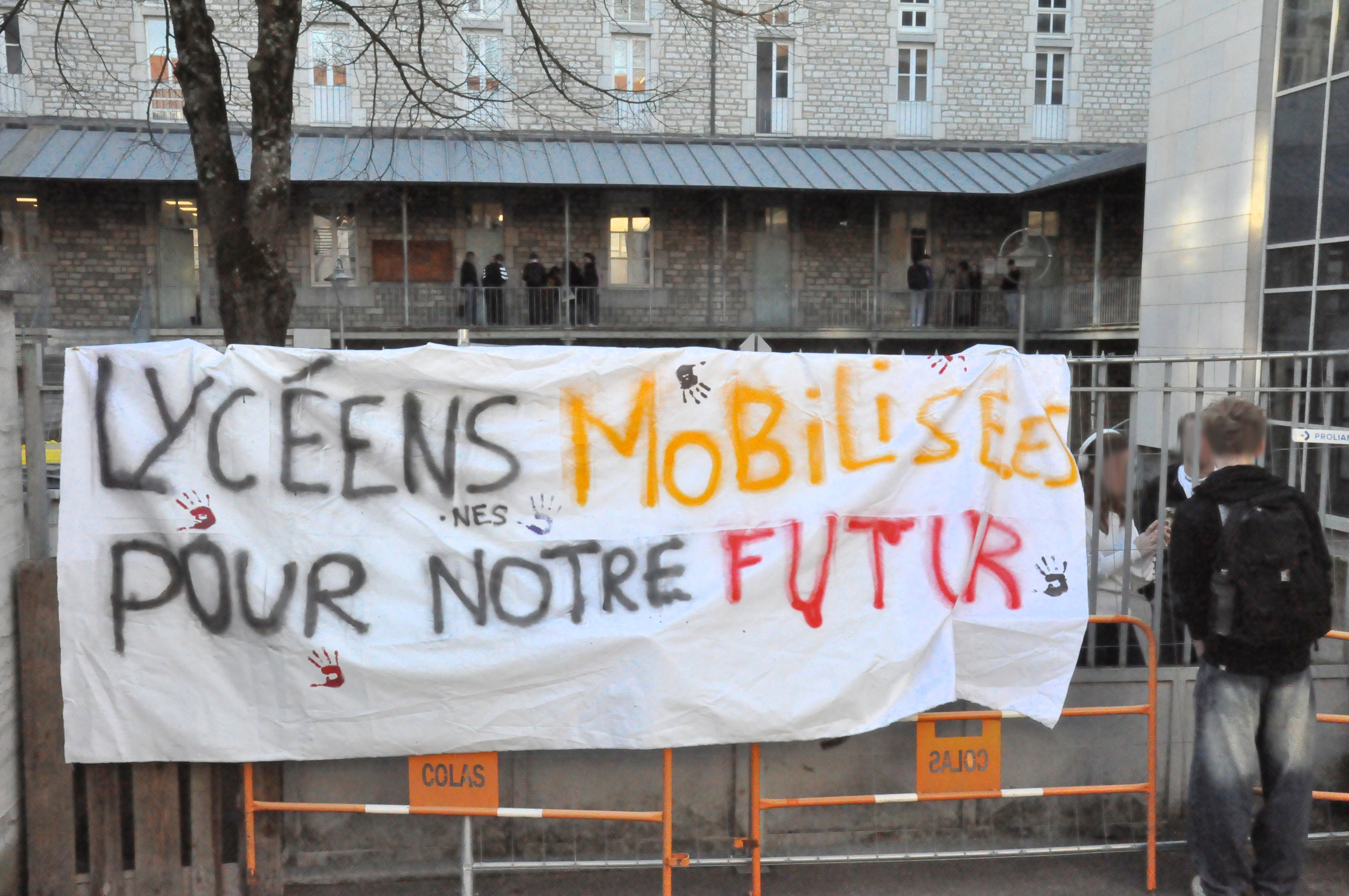 Illustration d’en-tête : Quelques pancartes, banderoles et visuels, affichés sur une grille du lycée Louis Pasteur de Besançon, durant le blocus.