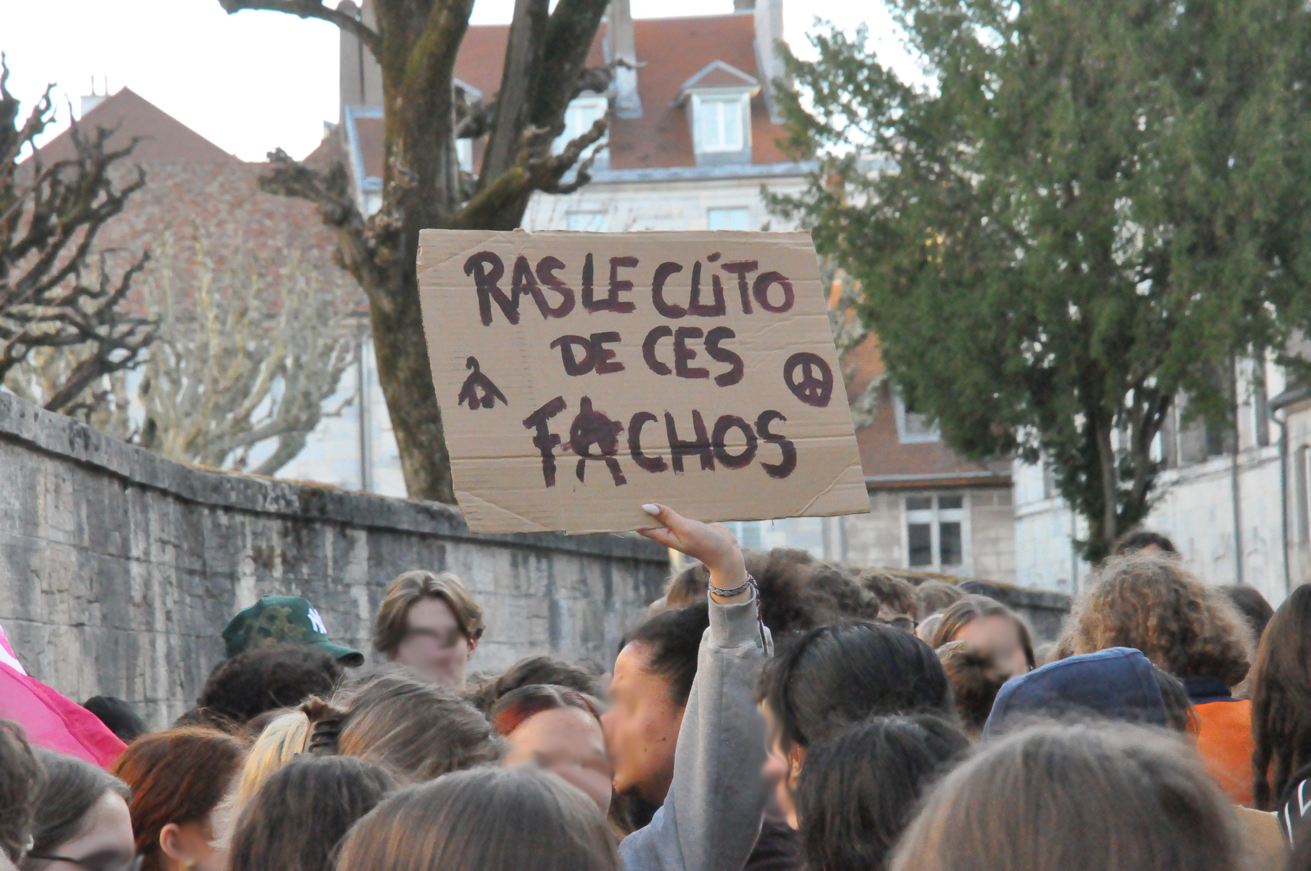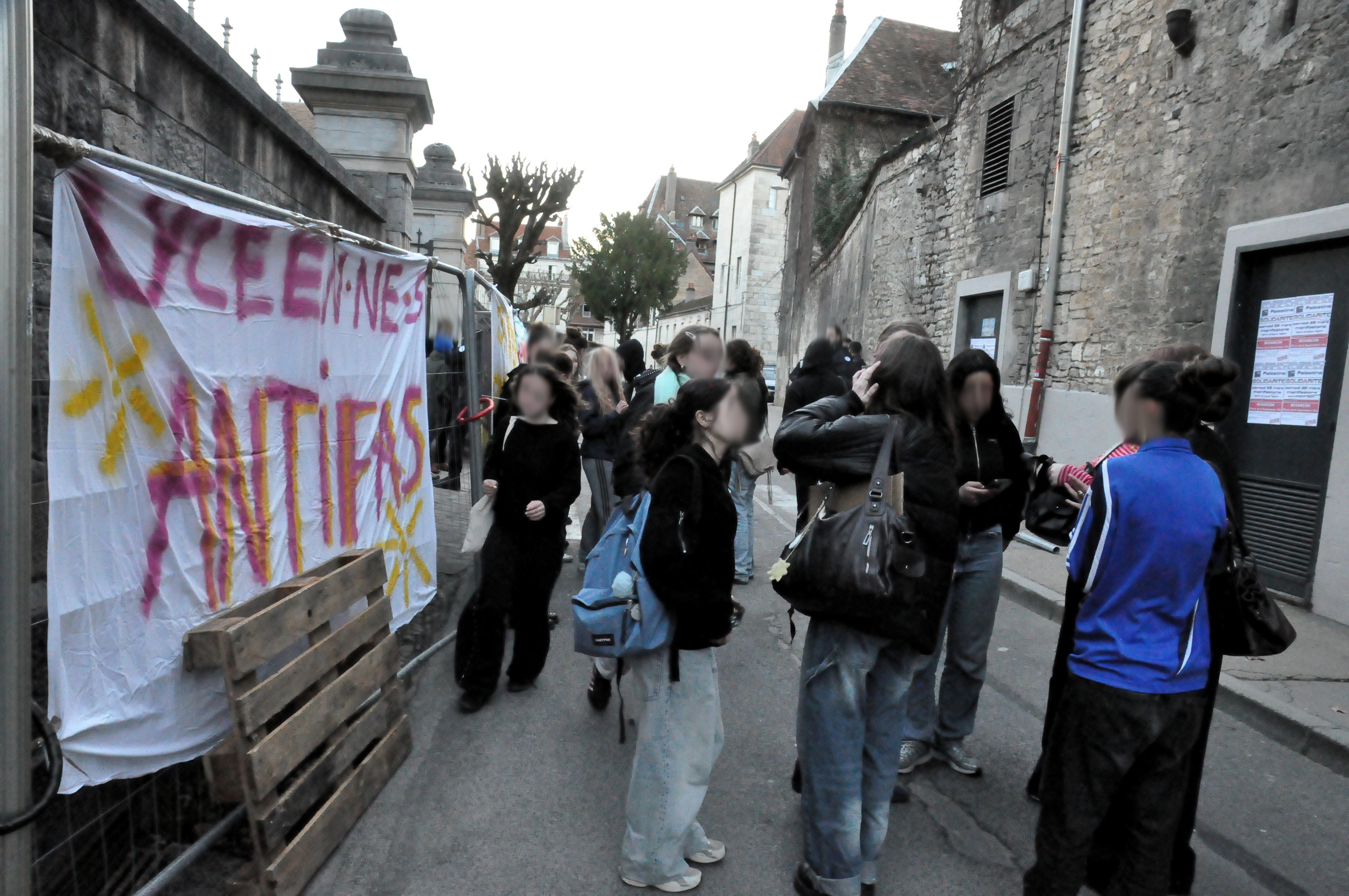 Sous l’égide de « l’Union Syndicale Lycéenne » (USL) et du « collectif BRAISE » (Bloc Radical Antifa Intersectionnel Solidaire Émancipateur Lycéen de Besançon), les 1 300 élèves ont trouvé portes closes. Solitaire, pas d’autre exemple n’ayant été relevé dans la région, mais déterminé, des centaines de protagonistes parfois venu·e·s d’autres bahuts étant impliqué·e·s, « Pasteur » trace sa voie. Un mouvement qui ne s’était pas vu depuis le 10 septembre dernier, mais dont le tournant massif à cette fois permis un siège jusqu’à midi. Musique, slogans, pancartes, évocant les questions antifa, la critique du régime Macron ou l’appréhension du prochain scrutin.